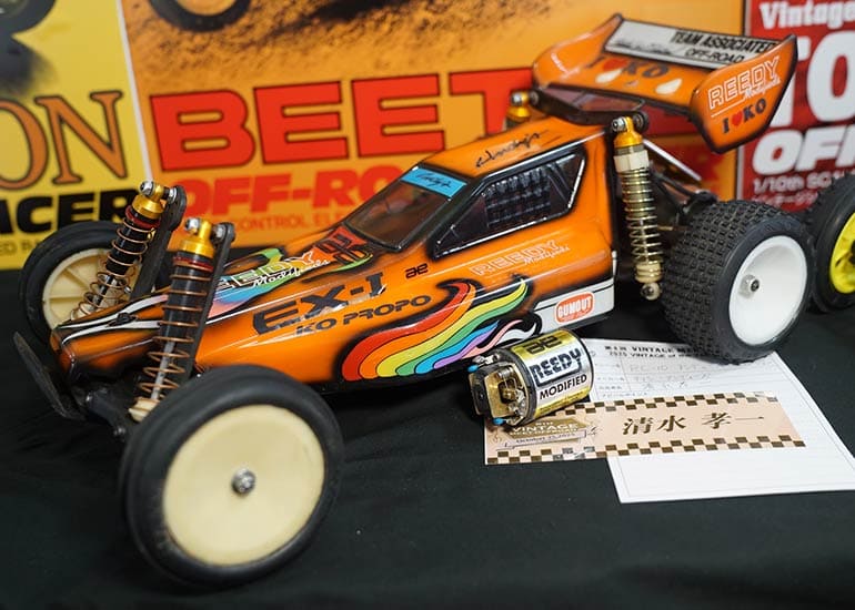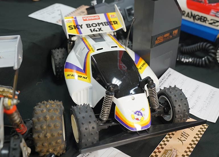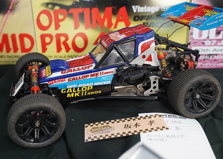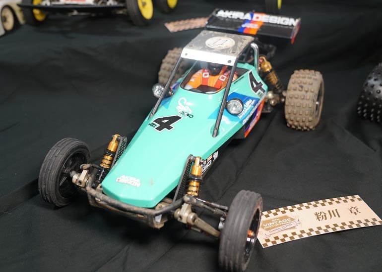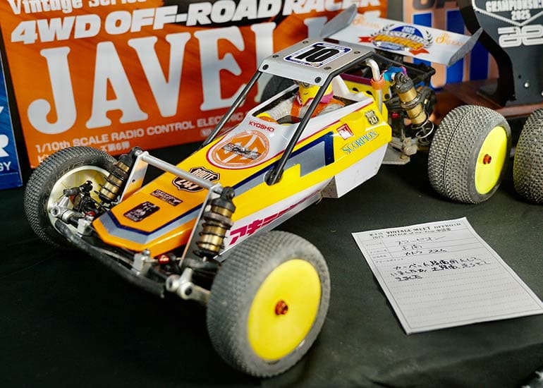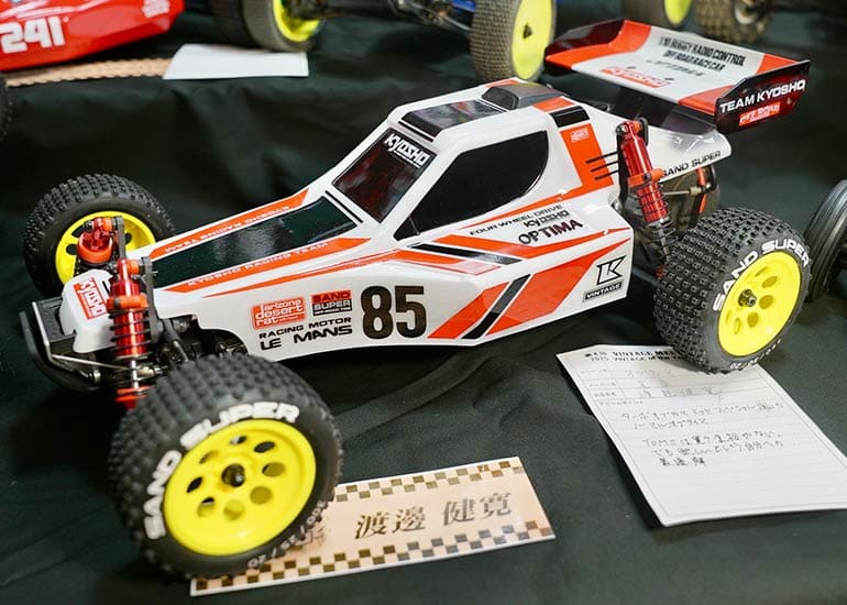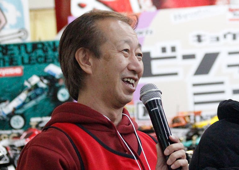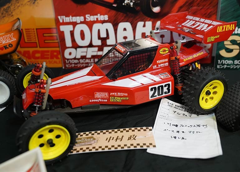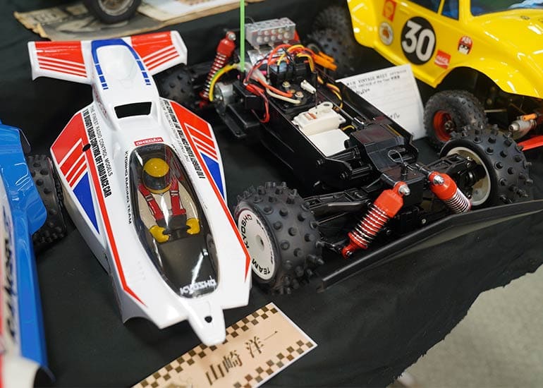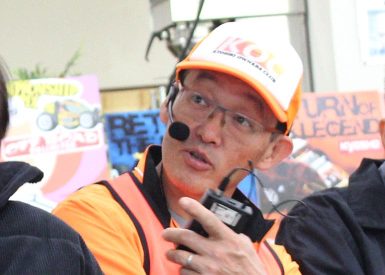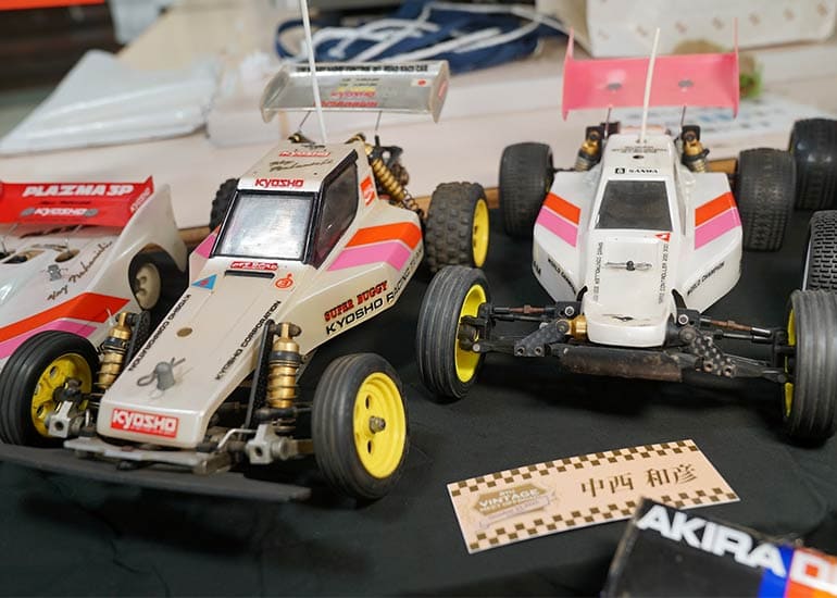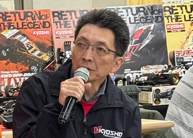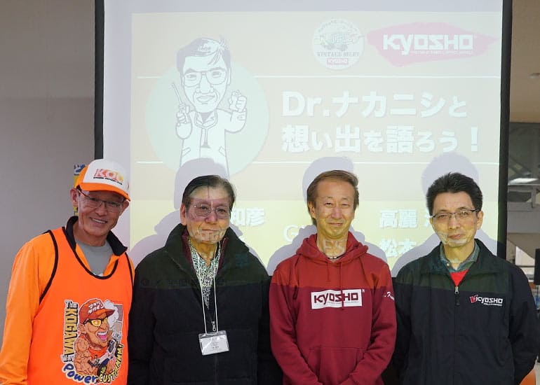 当時の熱気を伝えるトークショーには豪華ゲストが集結し、ビンテージシリーズ生みの親である粉川 章氏が今年も参加。そして、伝説の京商ワークスドライバー高麗 淳一氏と、現役の京商社員ドライバーの松本 裕之氏も会場を盛り上げます。さらに今回は特別ゲストとして、京商開発チームでEPレース部門を担当し、高麗さんの発掘にも大きな貢献をした、現在はサガミマイクロ代表取締役社長の中西 和弘(通称:ドクター中西)氏にもご参加いただきました。今回メインイベントの一つである熱気溢れるトークセッションでは、大型スクリーンに当時の貴重な記事や広告、そして秘蔵写真の数々を投影。豪華ゲスト4名が語る思い出話は、参加者にとっても何者にも代えがたいノスタルジーを感じさせてくれました。ただ単なる回顧録に留まらず、今まで表に出ることがなかった裏話も飛び出し、会場からは驚きの声も上がっていました。