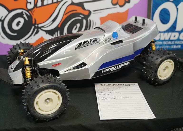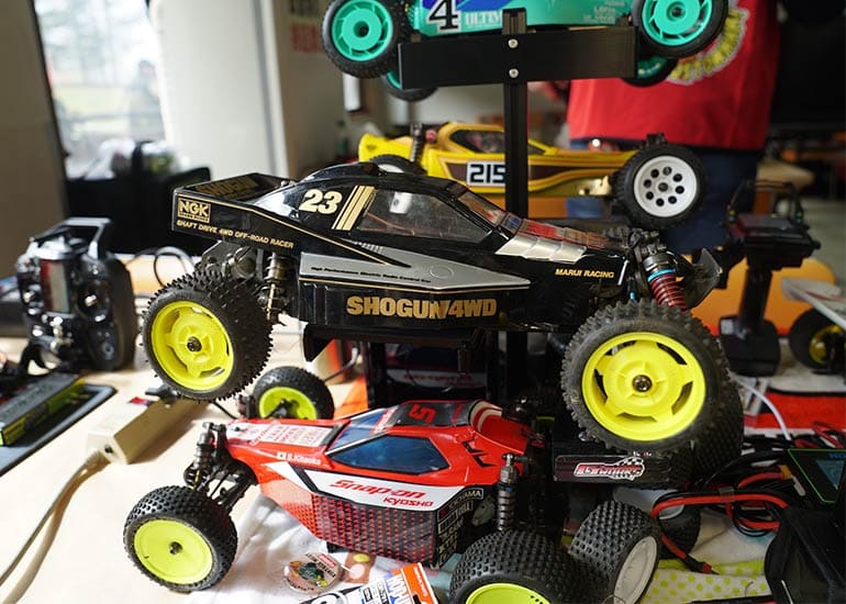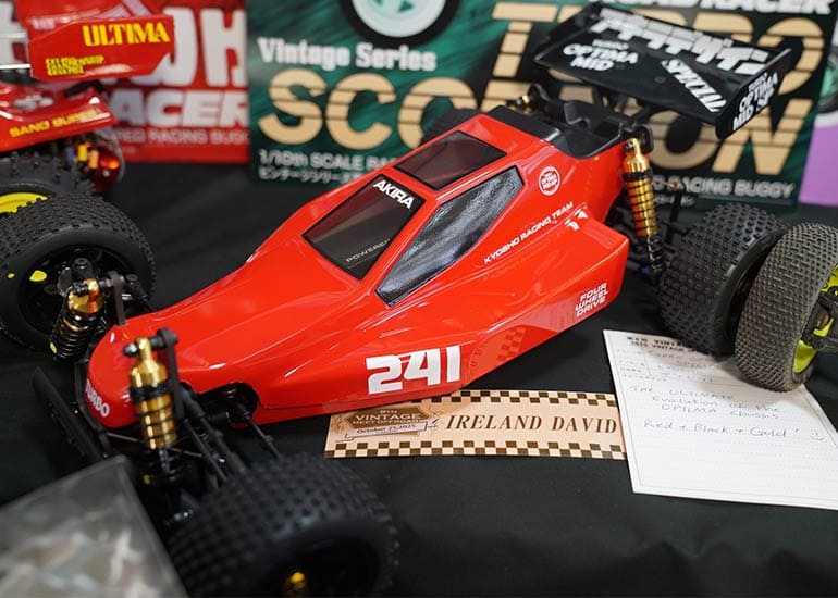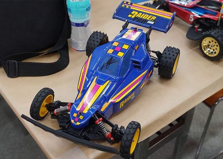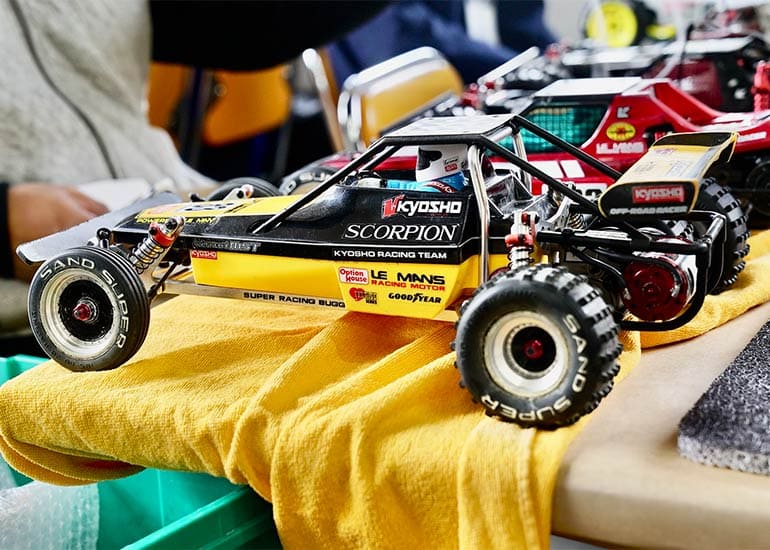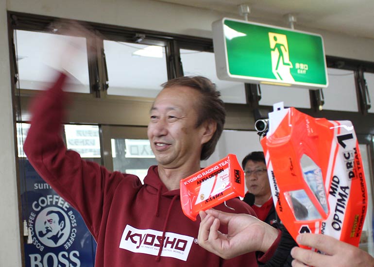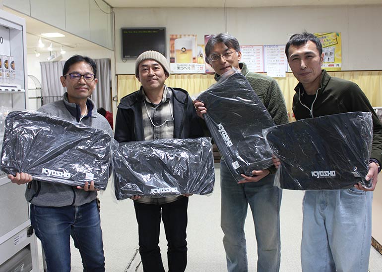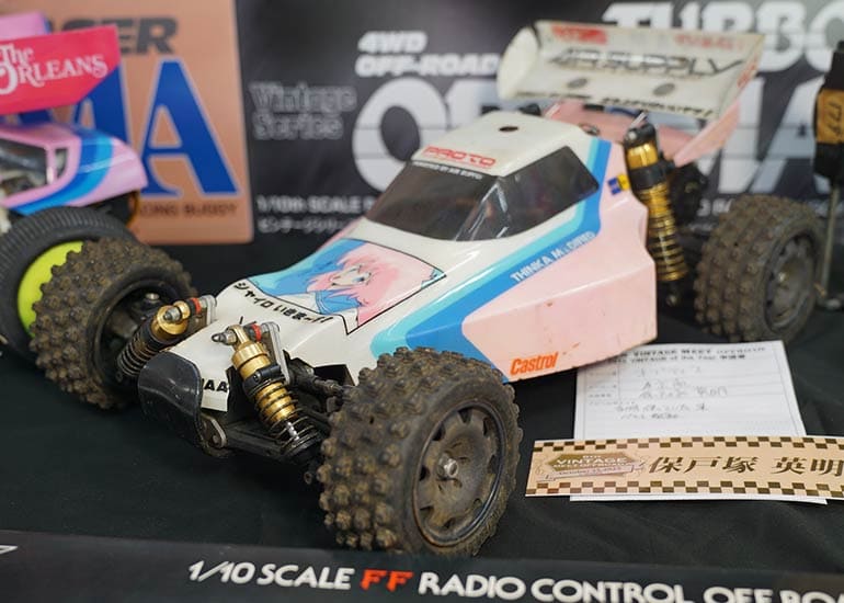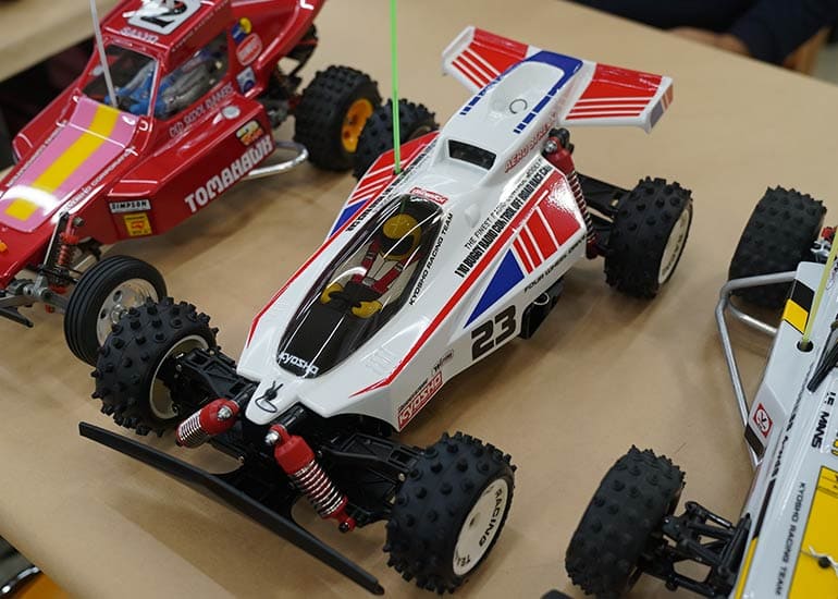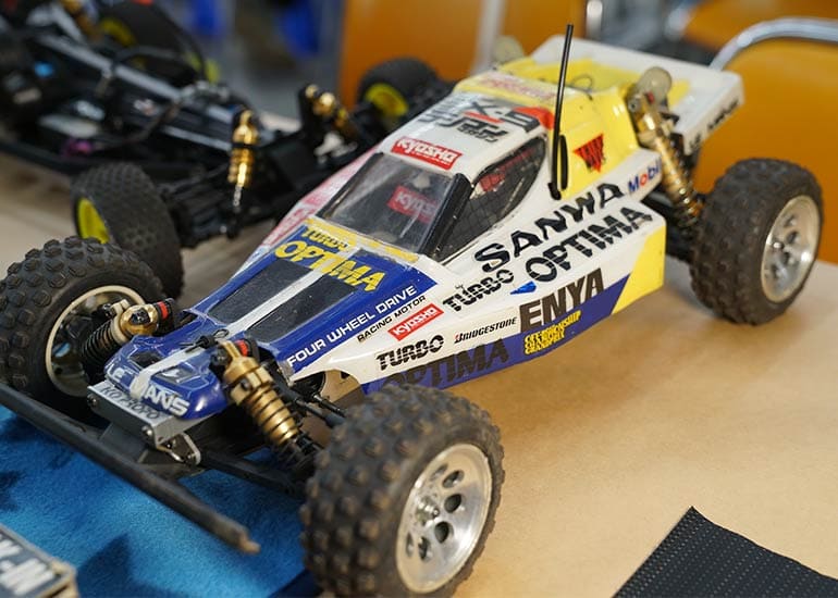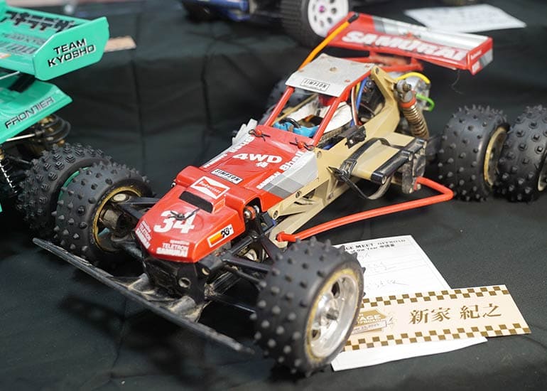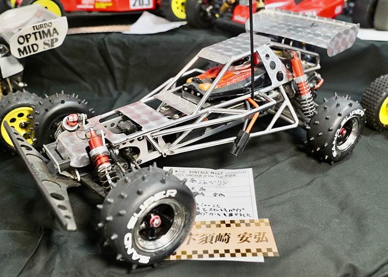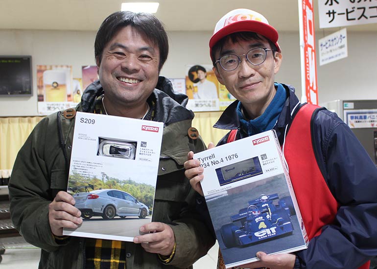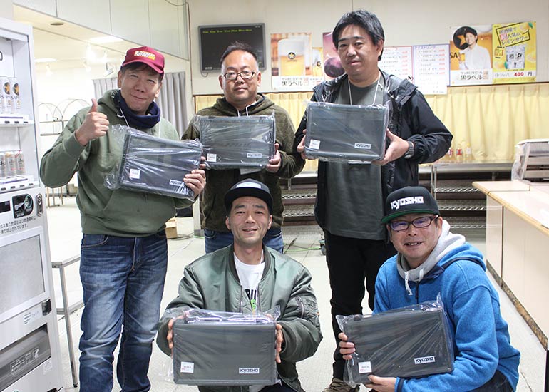 当時の熱気を伝えるトークショーには豪華ゲストが集結し、ビンテージシリーズ生みの親である粉川 章氏が今年も参加。そして、伝説の京商ワークスドライバー高麗 淳一氏と、現役の京商社員ドライバーの松本 裕之氏も会場を盛り上げます。さらに今回は特別ゲストとして、京商開発チームでEPレース部門を担当し、高麗さんの発掘にも大きな貢献をした、現在はサガミマイクロ代表取締役社長の中西 和弘(通称:ドクター中西)氏にもご参加いただきました。今回メインイベントの一つである熱気溢れるトークセッションでは、大型スクリーンに当時の貴重な記事や広告、そして秘蔵写真の数々を投影。豪華ゲスト4名が語る思い出話は、参加者にとっても何者にも代えがたいノスタルジーを感じさせてくれました。ただ単なる回顧録に留まらず、今まで表に出ることがなかった裏話も飛び出し、会場からは驚きの声も上がっていました。