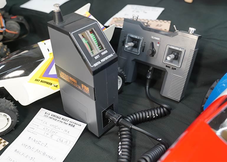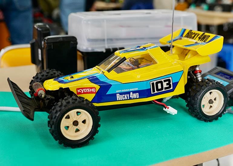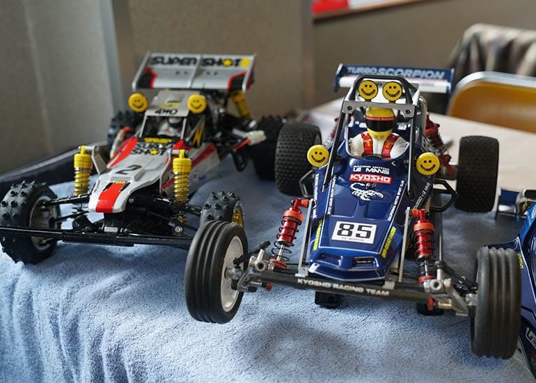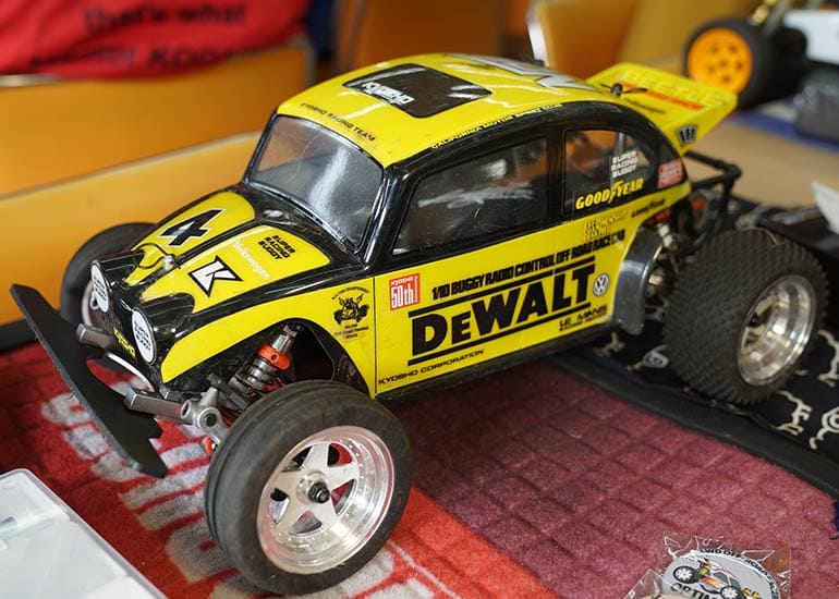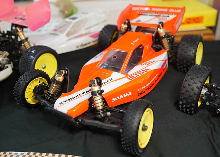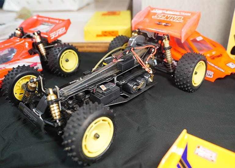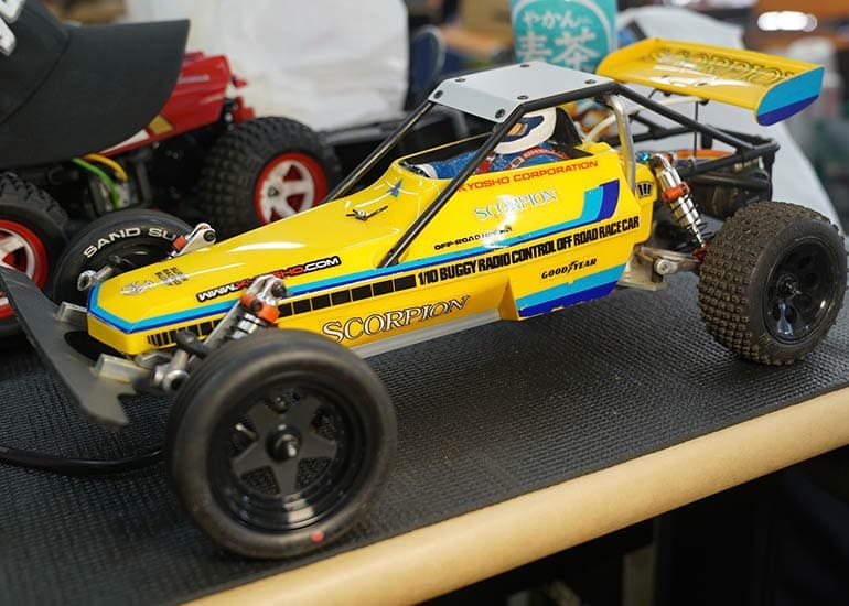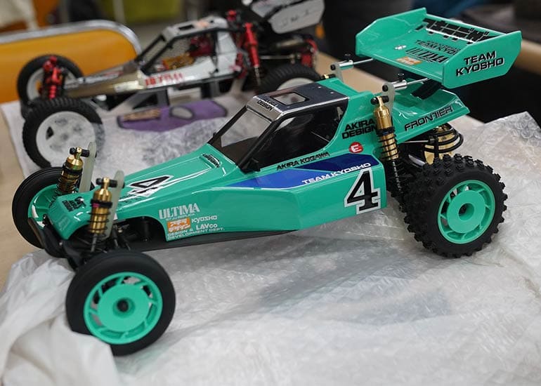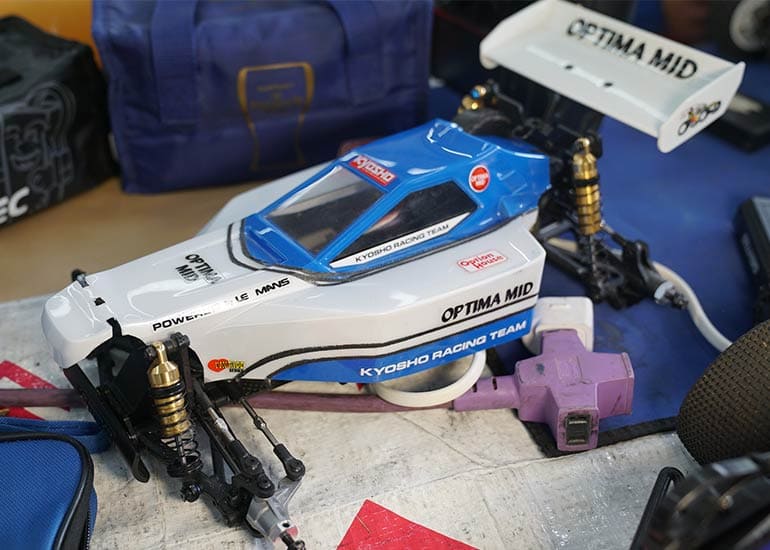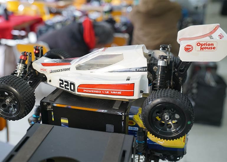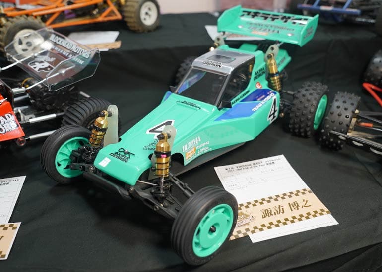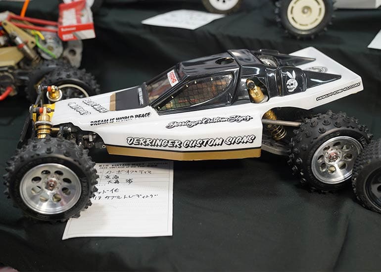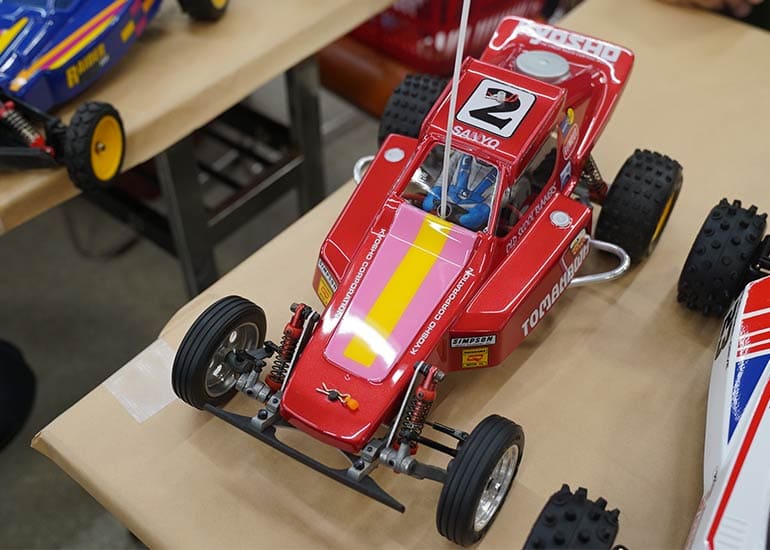 当時の熱気を伝えるトークショーには豪華ゲストが集結し、ビンテージシリーズ生みの親である粉川 章氏が今年も参加。そして、伝説の京商ワークスドライバー高麗 淳一氏と、現役の京商社員ドライバーの松本 裕之氏も会場を盛り上げます。さらに今回は特別ゲストとして、京商開発チームでEPレース部門を担当し、高麗さんの発掘にも大きな貢献をした、現在はサガミマイクロ代表取締役社長の中西 和弘(通称:ドクター中西)氏にもご参加いただきました。今回メインイベントの一つである熱気溢れるトークセッションでは、大型スクリーンに当時の貴重な記事や広告、そして秘蔵写真の数々を投影。豪華ゲスト4名が語る思い出話は、参加者にとっても何者にも代えがたいノスタルジーを感じさせてくれました。ただ単なる回顧録に留まらず、今まで表に出ることがなかった裏話も飛び出し、会場からは驚きの声も上がっていました。