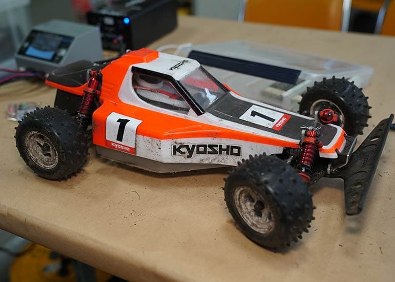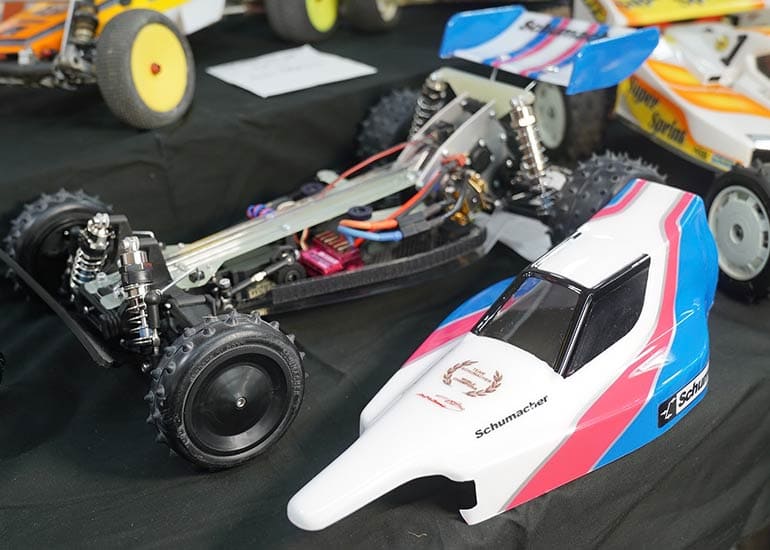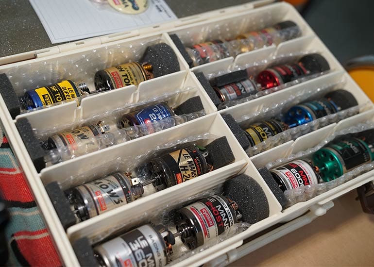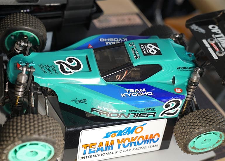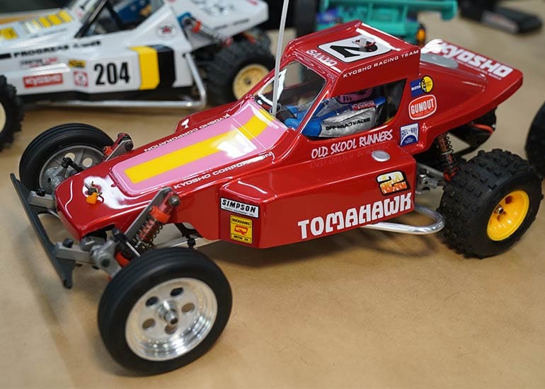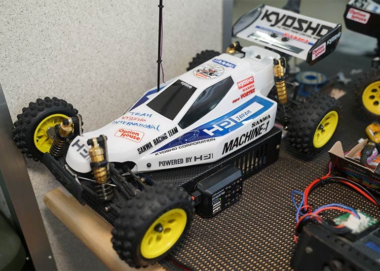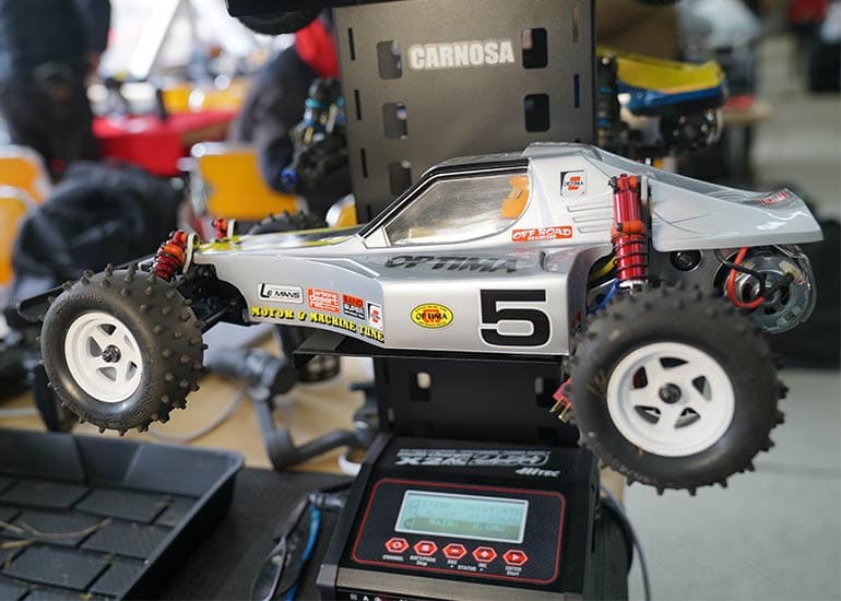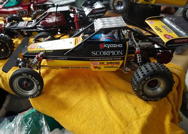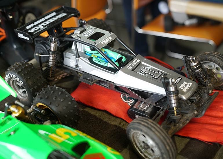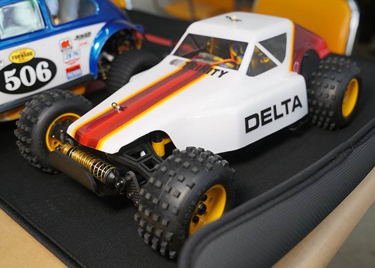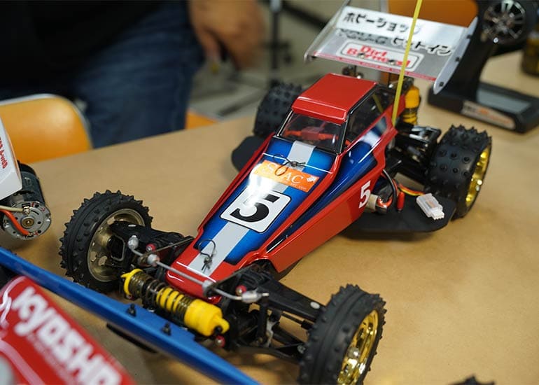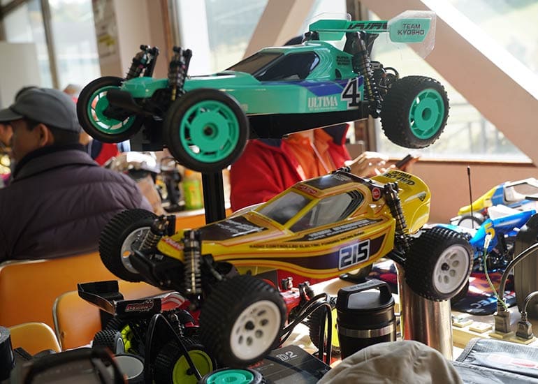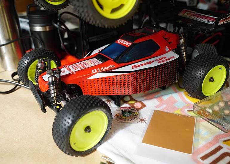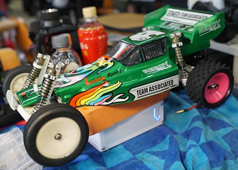 当時の熱気を伝えるトークショーには豪華ゲストが集結し、ビンテージシリーズ生みの親である粉川 章氏が今年も参加。そして、伝説の京商ワークスドライバー高麗 淳一氏と、現役の京商社員ドライバーの松本 裕之氏も会場を盛り上げます。さらに今回は特別ゲストとして、京商開発チームでEPレース部門を担当し、高麗さんの発掘にも大きな貢献をした、現在はサガミマイクロ代表取締役社長の中西 和弘(通称:ドクター中西)氏にもご参加いただきました。今回メインイベントの一つである熱気溢れるトークセッションでは、大型スクリーンに当時の貴重な記事や広告、そして秘蔵写真の数々を投影。豪華ゲスト4名が語る思い出話は、参加者にとっても何者にも代えがたいノスタルジーを感じさせてくれました。ただ単なる回顧録に留まらず、今まで表に出ることがなかった裏話も飛び出し、会場からは驚きの声も上がっていました。