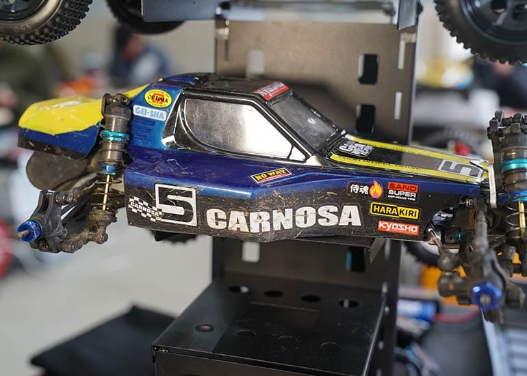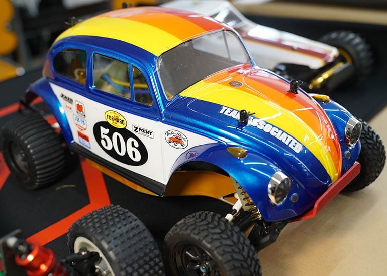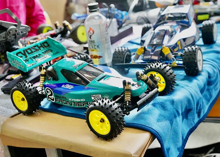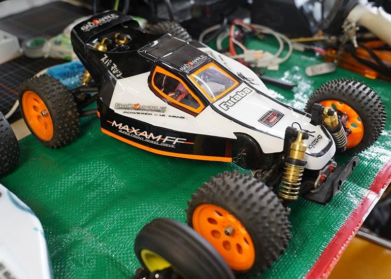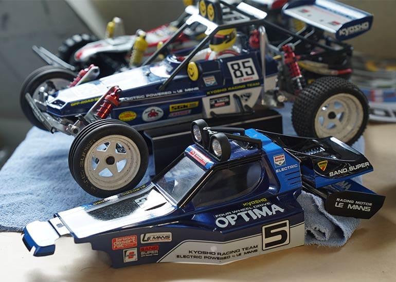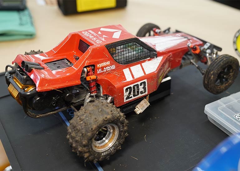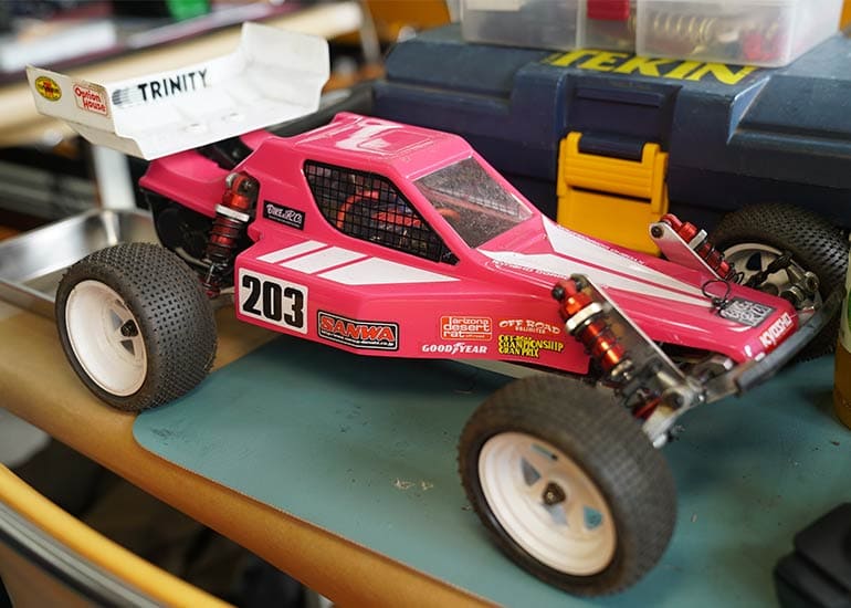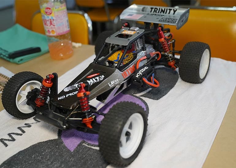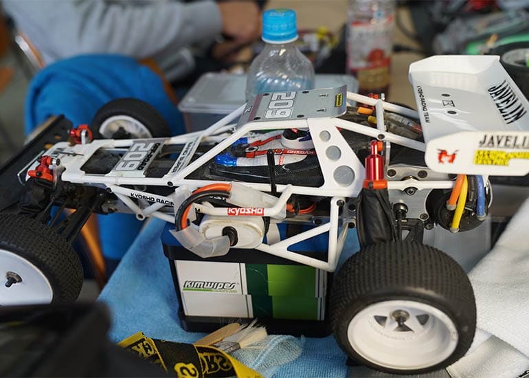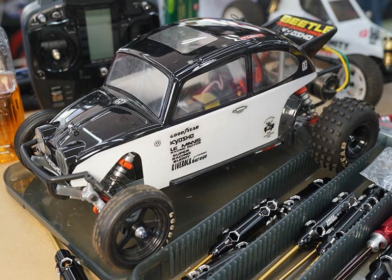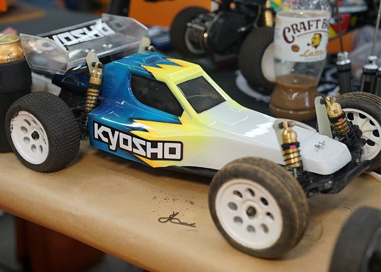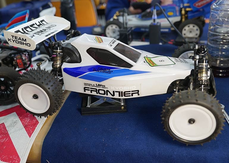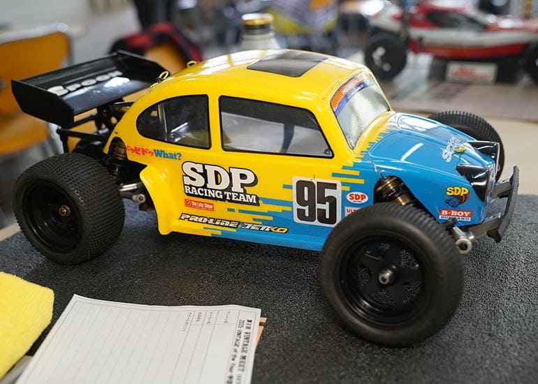当時の熱気を伝えるトークショーには豪華ゲストが集結し、ビンテージシリーズ生みの親である粉川 章氏が今年も参加。そして、伝説の京商ワークスドライバー高麗 淳一氏と、現役の京商社員ドライバーの松本 裕之氏も会場を盛り上げます。さらに今回は特別ゲストとして、京商開発チームでEPレース部門を担当し、高麗さんの発掘にも大きな貢献をした、現在はサガミマイクロ代表取締役社長の中西 和弘(通称:ドクター中西)氏にもご参加いただきました。今回メインイベントの一つである熱気溢れるトークセッションでは、大型スクリーンに当時の貴重な記事や広告、そして秘蔵写真の数々を投影。豪華ゲスト4名が語る思い出話は、参加者にとっても何者にも代えがたいノスタルジーを感じさせてくれました。ただ単なる回顧録に留まらず、今まで表に出ることがなかった裏話も飛び出し、会場からは驚きの声も上がっていました。