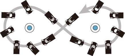 次はペットボトルなどを2コ、1.5mぐらい離して置いてください。そこを楕円で走ってみてください。イキナリ先ほどより難しいと思います。帰ってくるときはハンドル操作が逆になるのにも慣れましたか?速く走る必要はありません。いやむしろゆっくり走る努力が必要です。そう、同じ軌道で回ることができるかが重要なのです。