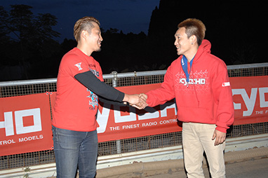 決勝ではTEAM KYOSHOから、勝ち上がりで、高城選手、河本選手がグランドファイナル入りを果たし 全10車中、京商勢4名となりました。決勝日。全車が綺麗なスタートを切りTQから松倉選手(BEST 40.884)が順当に飛ばしトップをキープ。田中和哉(BEST42.060)が1つ落とし3番手、続いて高城選手(7番グリット)が周囲の混乱に巻き込まれ10番手まで順位を落としてしまう。河本選手が8番手でコントロールラインを通過。20分が過ぎたところで、松倉選手が転倒ミスにより痛恨のエンジン・ストップ。24秒のアドバンテージ築いていたものの、コースに戻った時には3番手となった。その間、田中選手が全くのノーミスでトップに踊り立つ。そして、高城選手も他の選手と比べて、決してスピードが負けていない分、最下位のスタートから3番手まで車を進める。河本選手はベテランたる、ステディな走りで7番手を走行した。決勝60分。トップドライバー達は燃費とアクセル加減を計算しなければならないが、8分での給油が進められる。ピットマンとのコンビネーションが勝利を導き出す。34分の折り返し付近でトップが松倉選手、2番手田中選手となっていた。4番手に高城選手(3番手に無限精機 大阪選手 ギャップ差11秒)。6番手に河本選手。残り10分のところで田中和哉選手がベストラップ 41.990とこの時点でベストラップを叩き出す。 52分過ぎのところでドラマが起きた。最終コーナー手前のジャンプ中にトップを独走していた松倉選手が、ガス欠にて痛恨のエンジン・ストップ。ピットに戻り再スタートを切るが、コースに戻った時点で3番手。2番手大阪選手との差が約7秒。松倉選手が必死のリカバリーでマシンを猛プッシュする。残り3分のレースアナウンスが流れる中、松倉選手が2番手に浮上。しかし、トップを走る田中選手がベテランかつ、貫禄さえあるドライビングで優勝を飾った。チーム京商は勝利奪還に成功した。田中選手おめでとう!そしてありがとう!