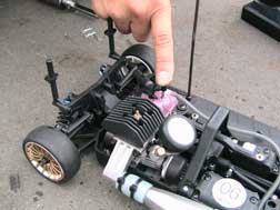 4)プラグヒーターを押さえながらリコイルスターターを素早く引っ張ります。この時にプロポのスロットルは全開のほうがエンジンがかかりやすいでしょう。リコイルは何回か連続で引き、エンジンがかかったら素早くスロットルを戻します。また、クルマが暴走しないようにクルマの前方をフェンスやブロックなどでガードしたほうが安全です。 |