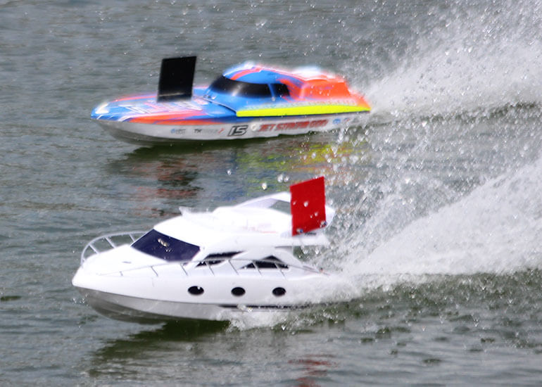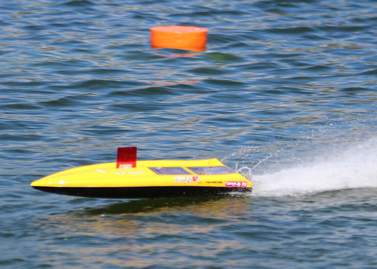 船底がV型以外の船体を使用するレース。船を真正面から見ると中央は空洞で、その姿はトンネルのよう・・・。今シーズンではGens ace LiPoバッテリーが解禁になった事もあり、スピードレンジは大きく上昇。トンネルクラスは船底がV型タイプではないので安定しているようだが、意外と横転しやすい。またV型はクルっと元に戻りやすいが、トンネル型は復帰するのは難しく、1度でも横転すると挽回は困難を極める。レースでは、日頃の練習成果を発揮した柳澤選手がフルマークで、見事な完全優勝となった。
