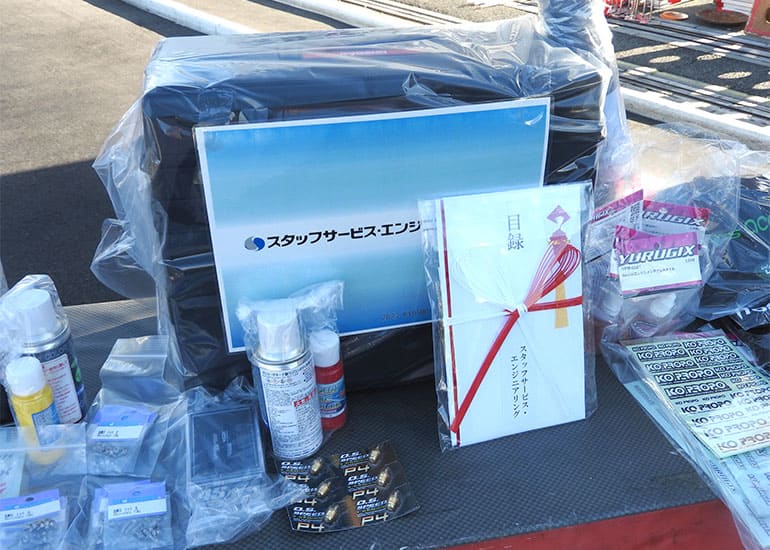 メインスポンサーのスタッフサービス・エンジニアリング様からはお米券1万円分とピットボックスをご提供いただきました。ご協賛をいただいたスポンサーの皆様、ありがとうございました。