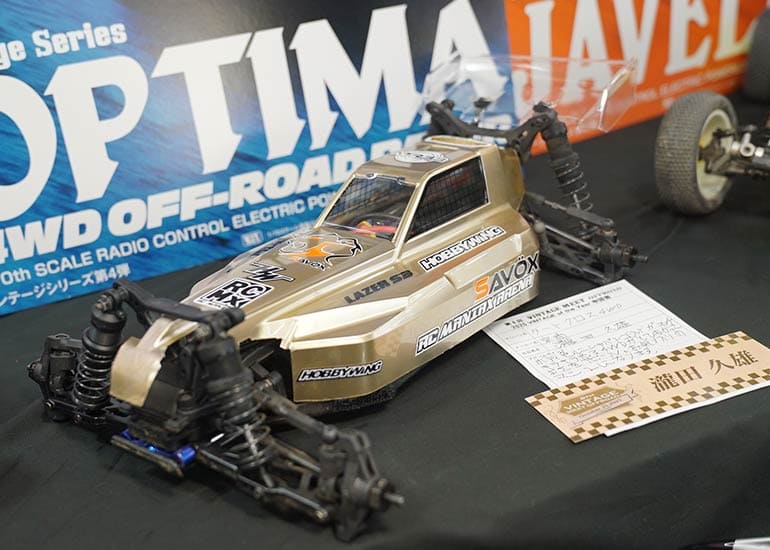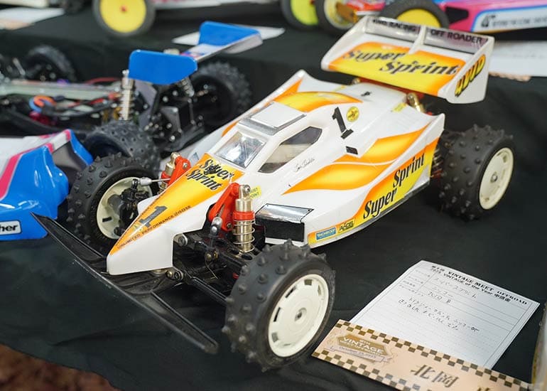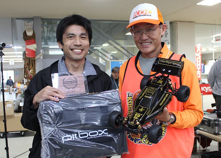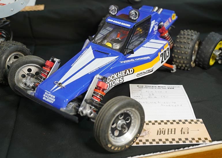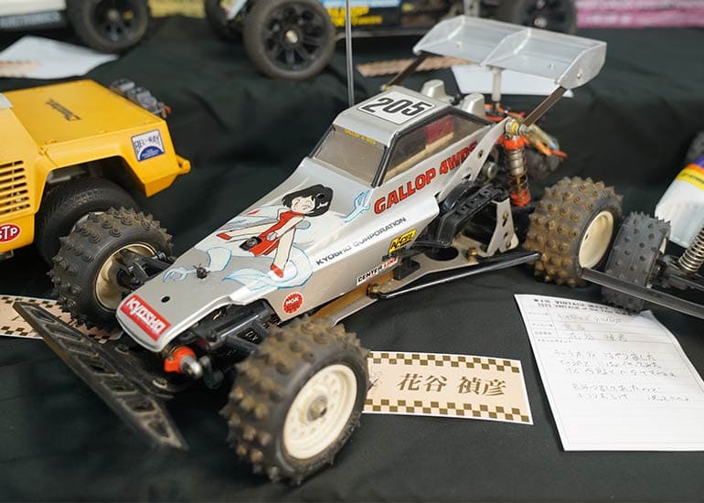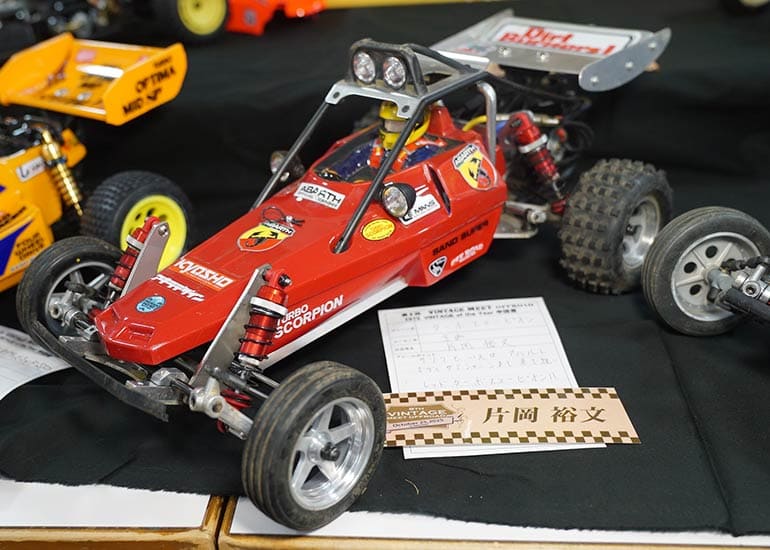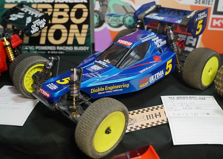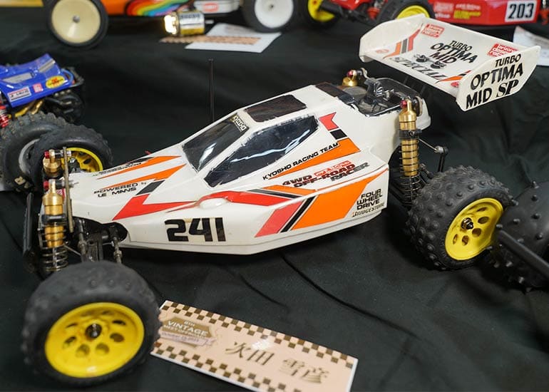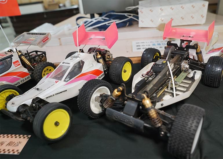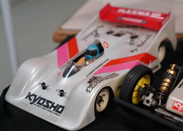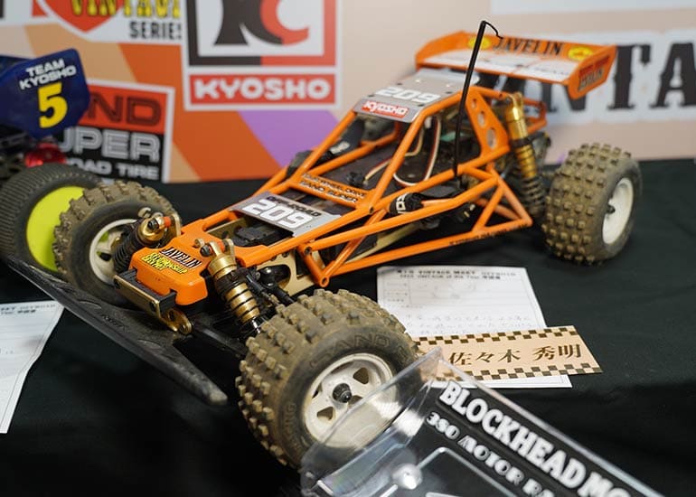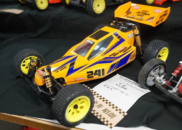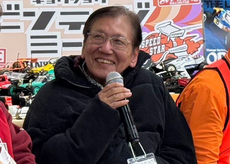 当時の熱気を伝えるトークショーには豪華ゲストが集結し、ビンテージシリーズ生みの親である粉川 章氏が今年も参加。そして、伝説の京商ワークスドライバー高麗 淳一氏と、現役の京商社員ドライバーの松本 裕之氏も会場を盛り上げます。さらに今回は特別ゲストとして、京商開発チームでEPレース部門を担当し、高麗さんの発掘にも大きな貢献をした、現在はサガミマイクロ代表取締役社長の中西 和弘(通称:ドクター中西)氏にもご参加いただきました。今回メインイベントの一つである熱気溢れるトークセッションでは、大型スクリーンに当時の貴重な記事や広告、そして秘蔵写真の数々を投影。豪華ゲスト4名が語る思い出話は、参加者にとっても何者にも代えがたいノスタルジーを感じさせてくれました。ただ単なる回顧録に留まらず、今まで表に出ることがなかった裏話も飛び出し、会場からは驚きの声も上がっていました。
