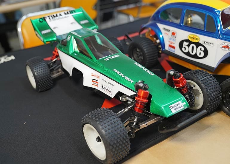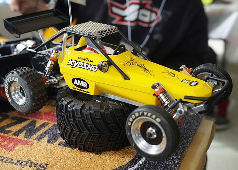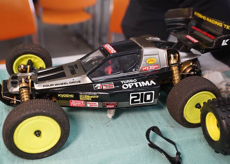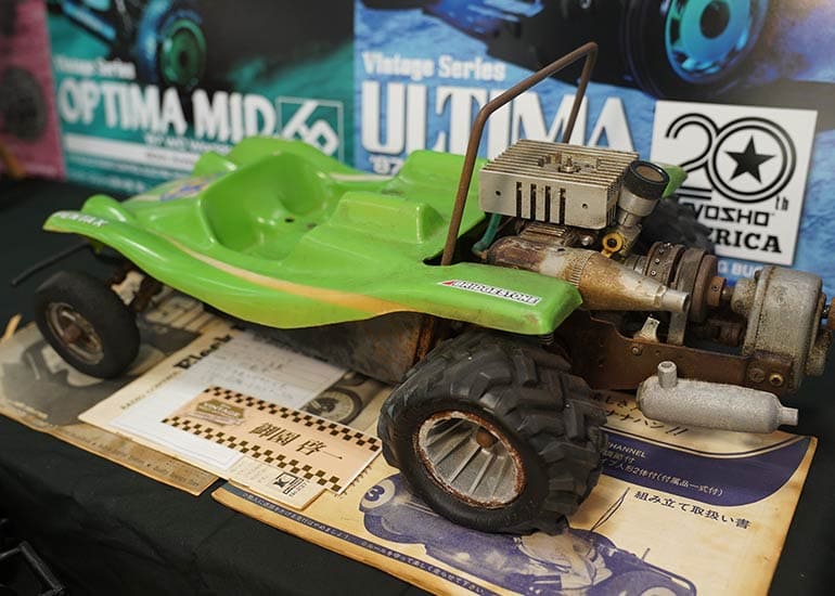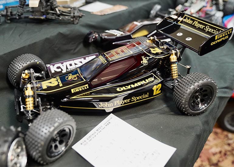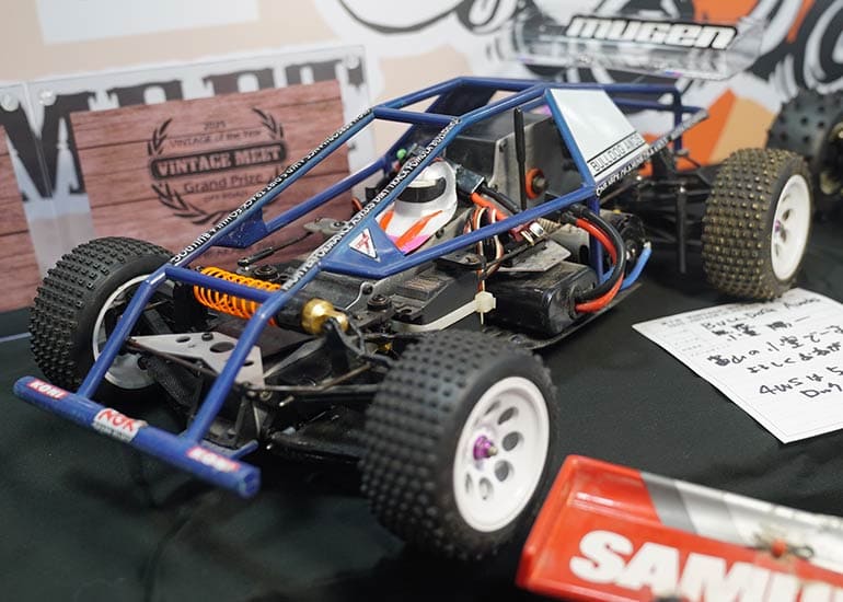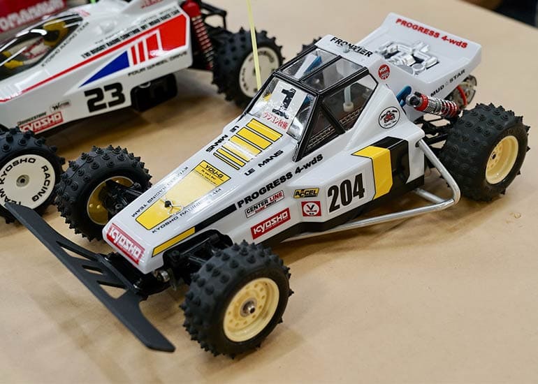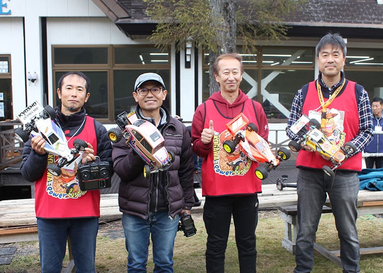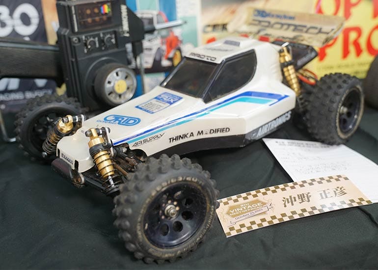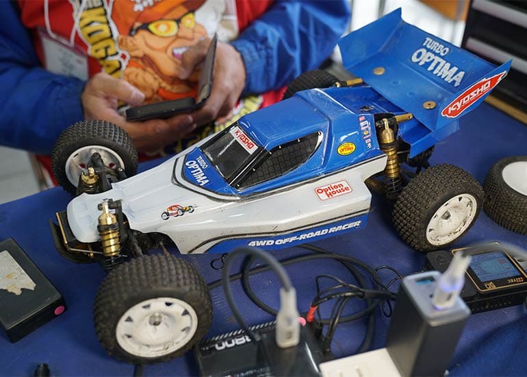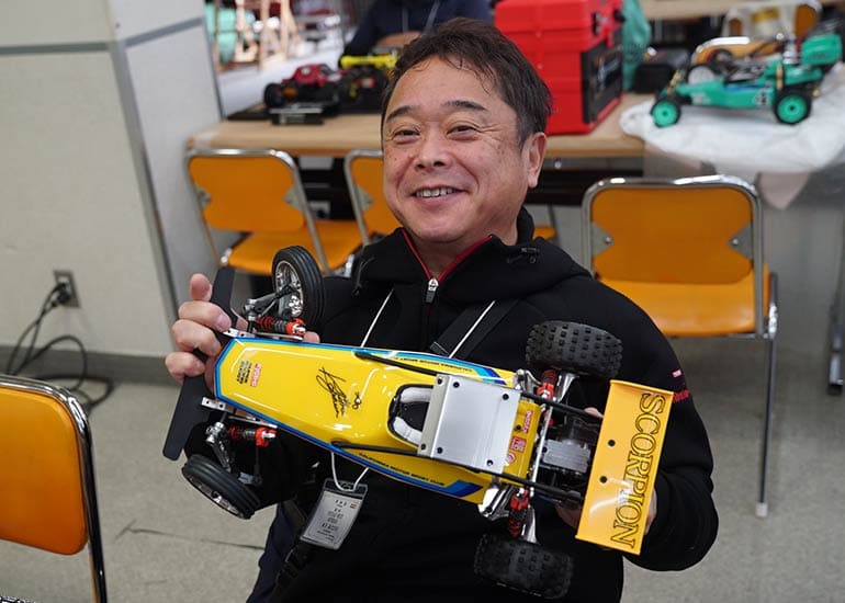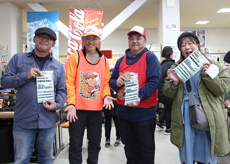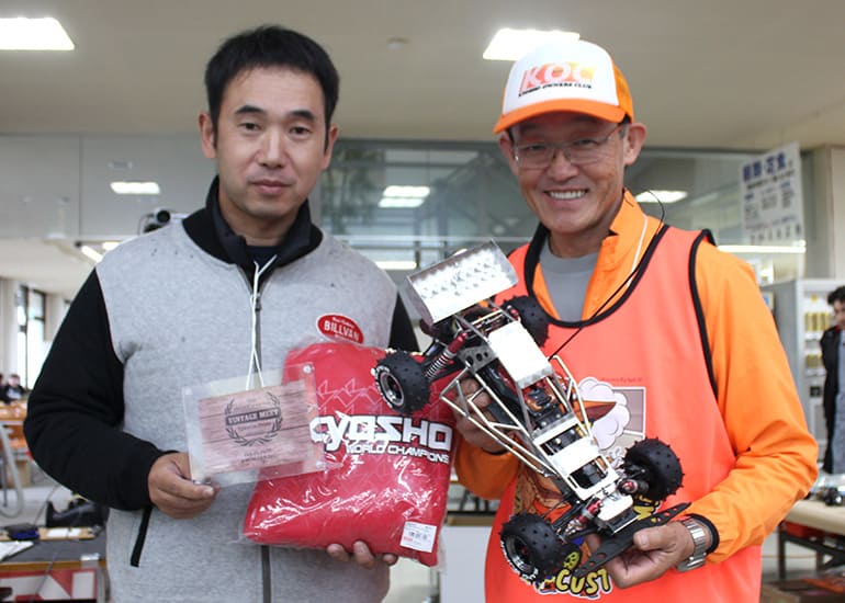 当時の熱気を伝えるトークショーには豪華ゲストが集結し、ビンテージシリーズ生みの親である粉川 章氏が今年も参加。そして、伝説の京商ワークスドライバー高麗 淳一氏と、現役の京商社員ドライバーの松本 裕之氏も会場を盛り上げます。さらに今回は特別ゲストとして、京商開発チームでEPレース部門を担当し、高麗さんの発掘にも大きな貢献をした、現在はサガミマイクロ代表取締役社長の中西 和弘(通称:ドクター中西)氏にもご参加いただきました。今回メインイベントの一つである熱気溢れるトークセッションでは、大型スクリーンに当時の貴重な記事や広告、そして秘蔵写真の数々を投影。豪華ゲスト4名が語る思い出話は、参加者にとっても何者にも代えがたいノスタルジーを感じさせてくれました。ただ単なる回顧録に留まらず、今まで表に出ることがなかった裏話も飛び出し、会場からは驚きの声も上がっていました。