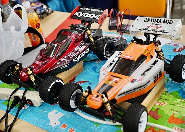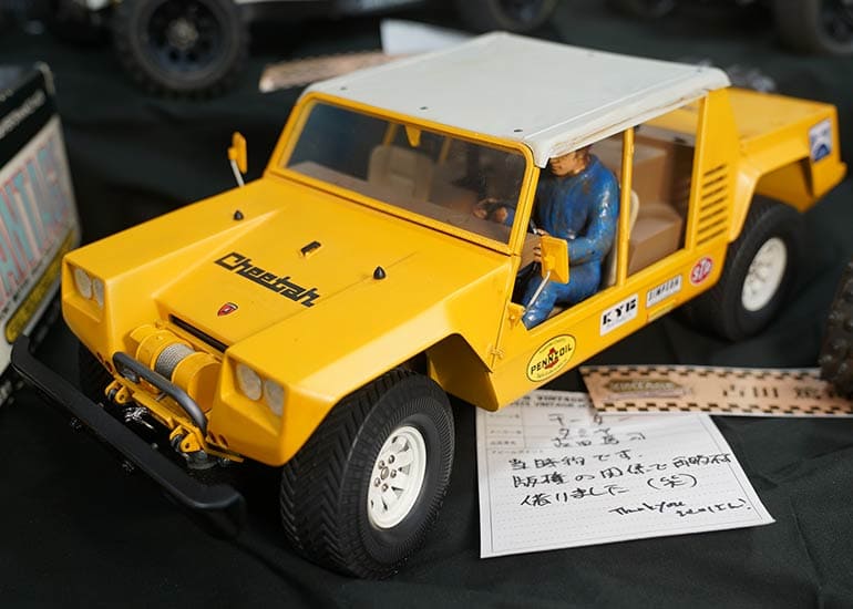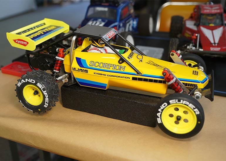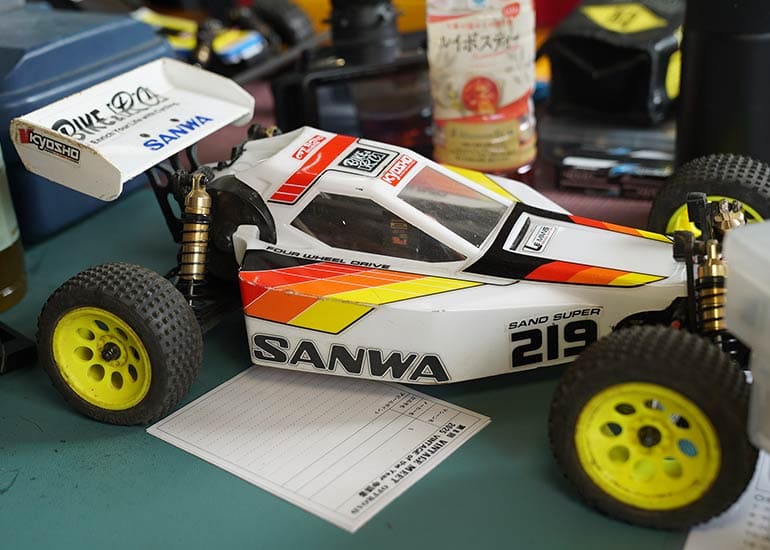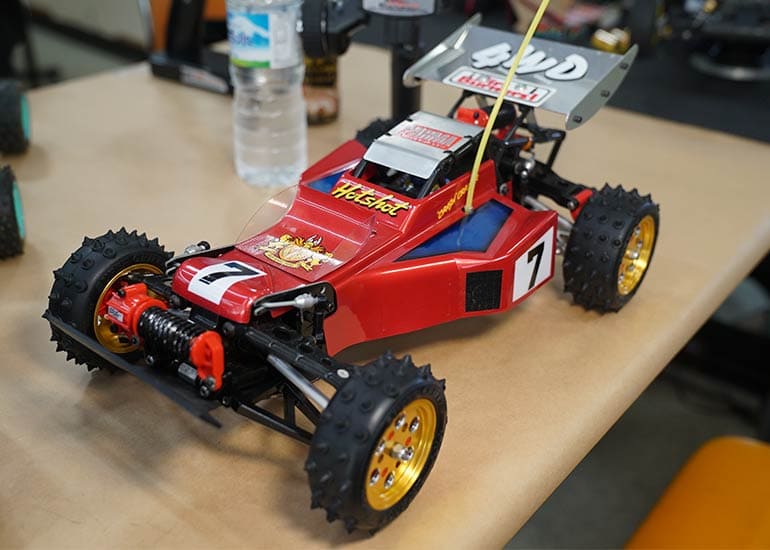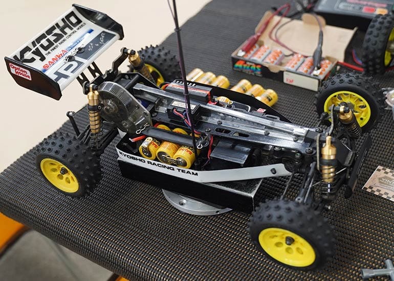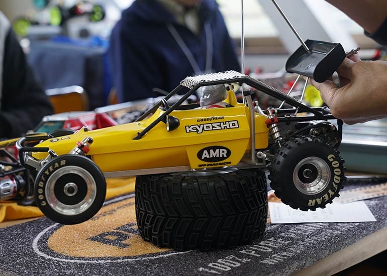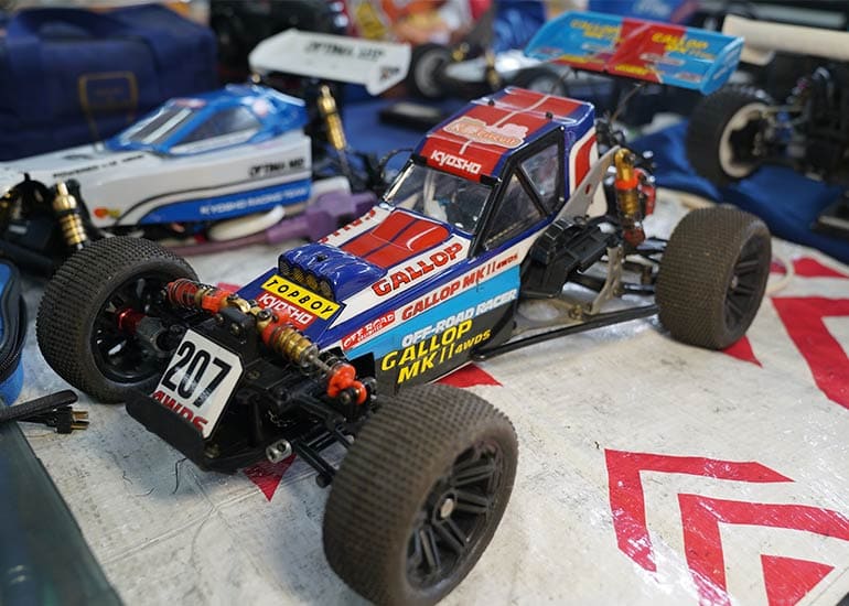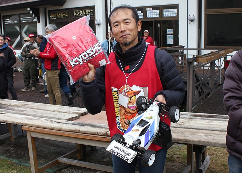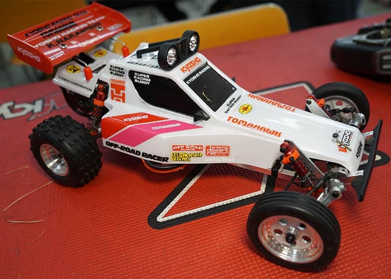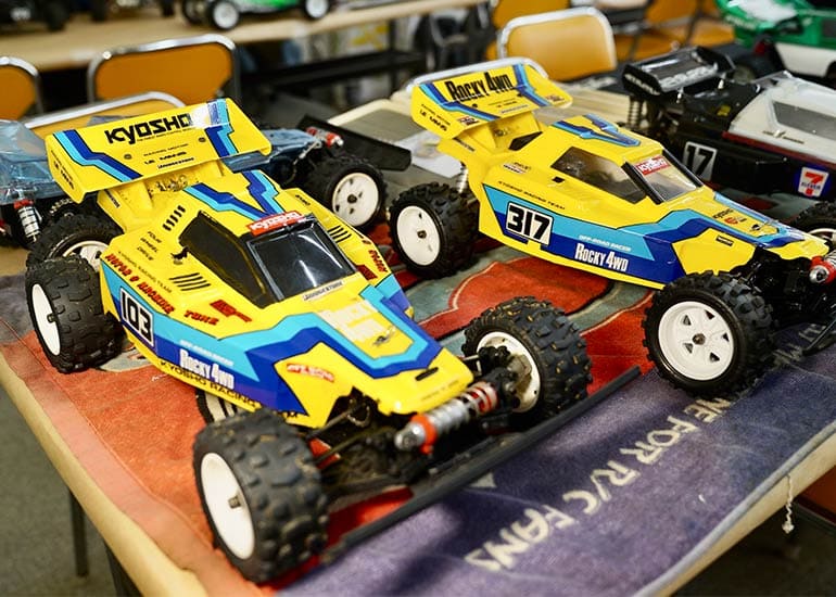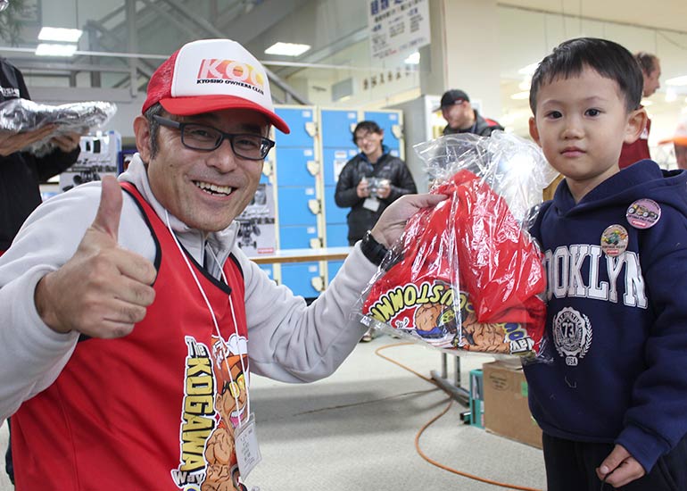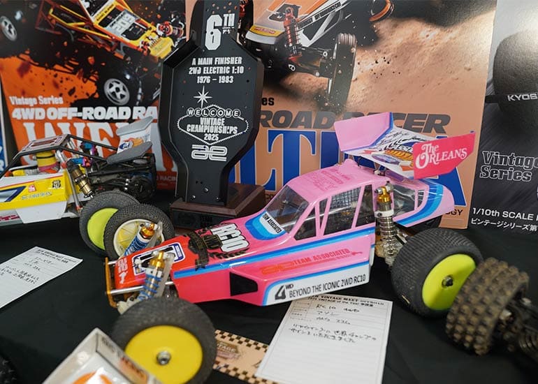 当時の熱気を伝えるトークショーには豪華ゲストが集結し、ビンテージシリーズ生みの親である粉川 章氏が今年も参加。そして、伝説の京商ワークスドライバー高麗 淳一氏と、現役の京商社員ドライバーの松本 裕之氏も会場を盛り上げます。さらに今回は特別ゲストとして、京商開発チームでEPレース部門を担当し、高麗さんの発掘にも大きな貢献をした、現在はサガミマイクロ代表取締役社長の中西 和弘(通称:ドクター中西)氏にもご参加いただきました。今回メインイベントの一つである熱気溢れるトークセッションでは、大型スクリーンに当時の貴重な記事や広告、そして秘蔵写真の数々を投影。豪華ゲスト4名が語る思い出話は、参加者にとっても何者にも代えがたいノスタルジーを感じさせてくれました。ただ単なる回顧録に留まらず、今まで表に出ることがなかった裏話も飛び出し、会場からは驚きの声も上がっていました。