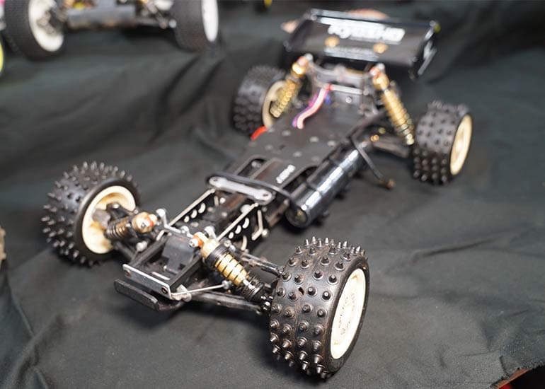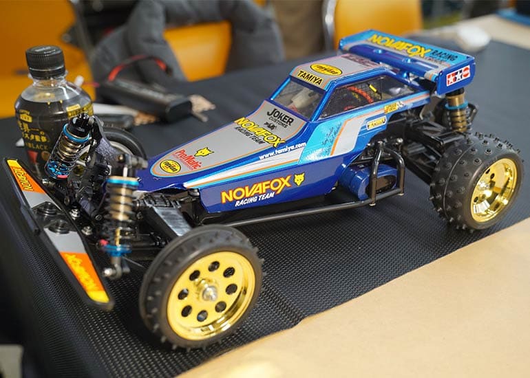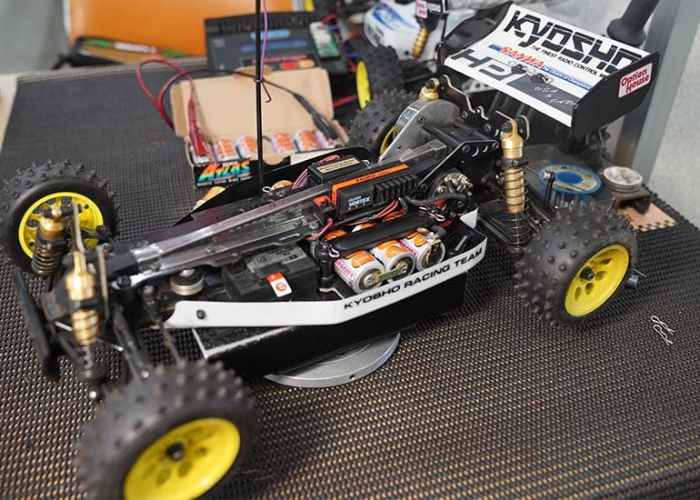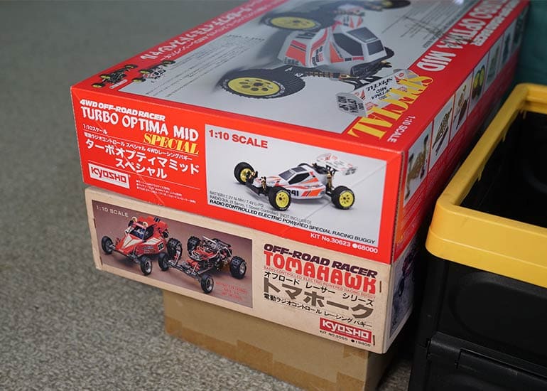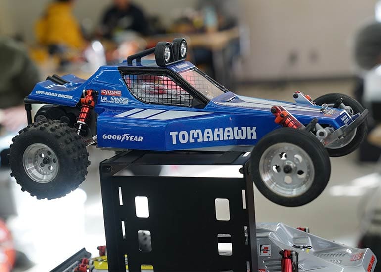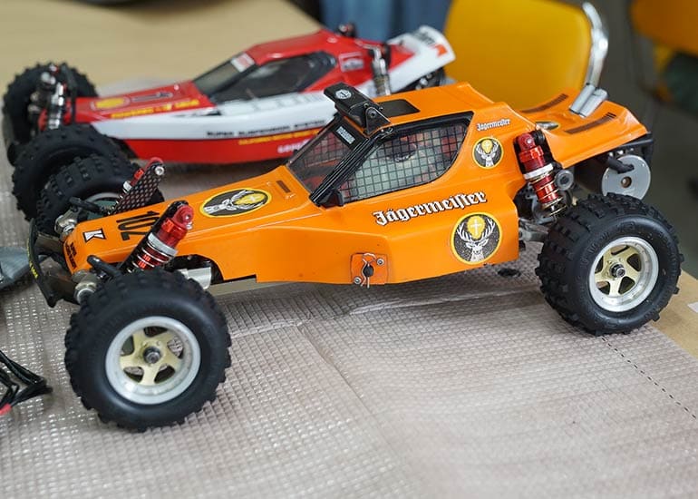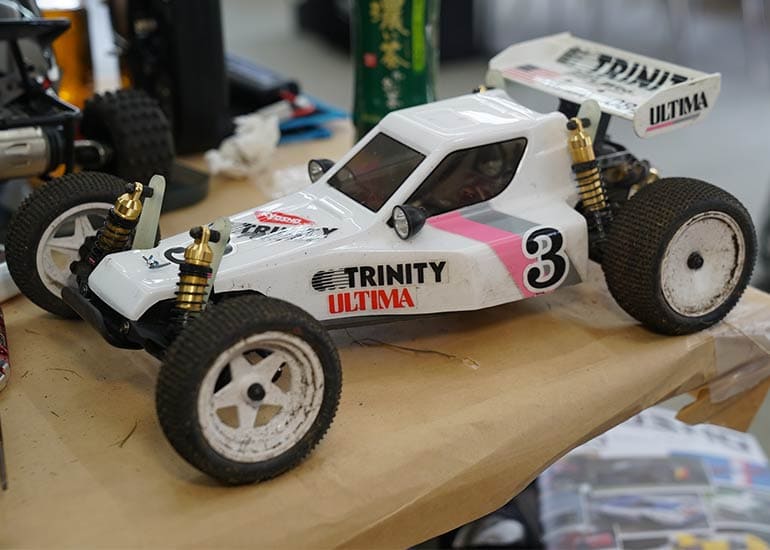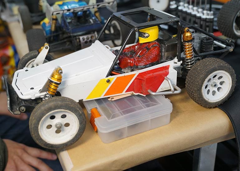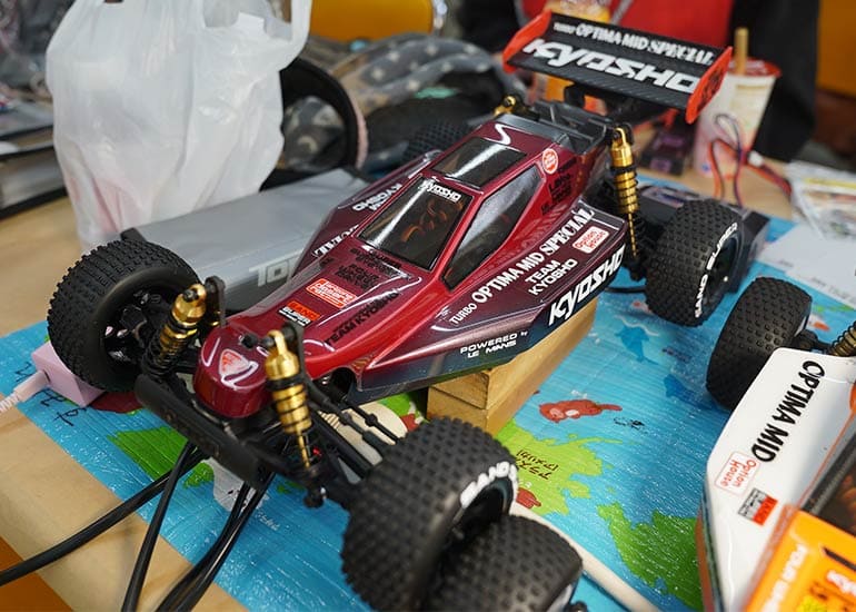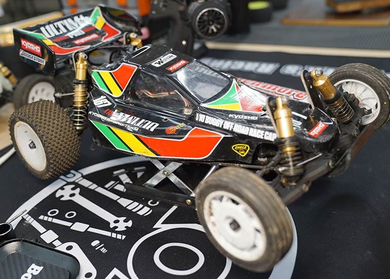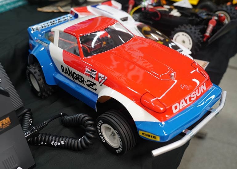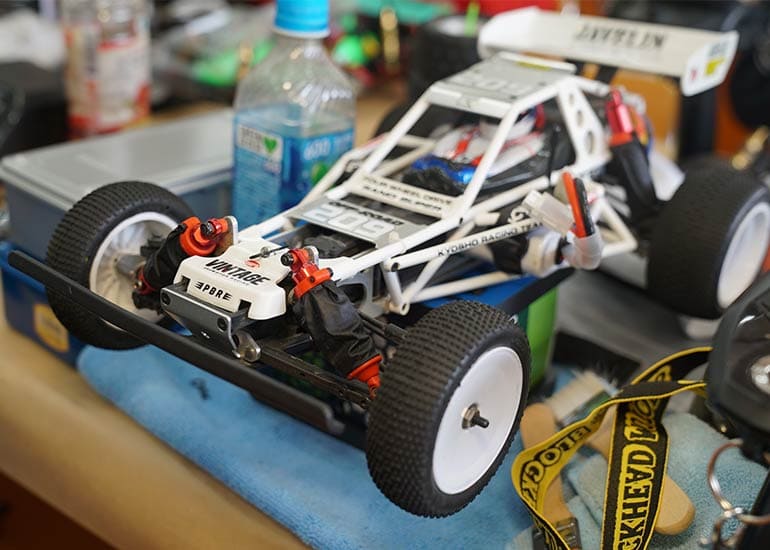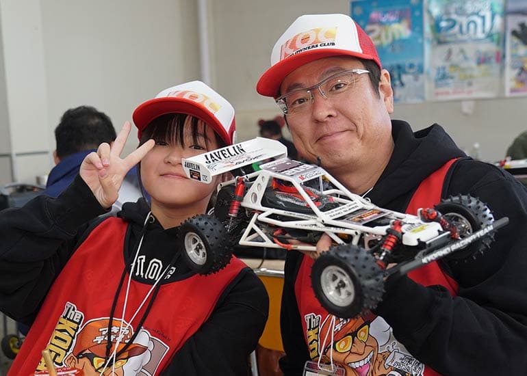 当時の熱気を伝えるトークショーには豪華ゲストが集結し、ビンテージシリーズ生みの親である粉川 章氏が今年も参加。そして、伝説の京商ワークスドライバー高麗 淳一氏と、現役の京商社員ドライバーの松本 裕之氏も会場を盛り上げます。さらに今回は特別ゲストとして、京商開発チームでEPレース部門を担当し、高麗さんの発掘にも大きな貢献をした、現在はサガミマイクロ代表取締役社長の中西 和弘(通称:ドクター中西)氏にもご参加いただきました。今回メインイベントの一つである熱気溢れるトークセッションでは、大型スクリーンに当時の貴重な記事や広告、そして秘蔵写真の数々を投影。豪華ゲスト4名が語る思い出話は、参加者にとっても何者にも代えがたいノスタルジーを感じさせてくれました。ただ単なる回顧録に留まらず、今まで表に出ることがなかった裏話も飛び出し、会場からは驚きの声も上がっていました。