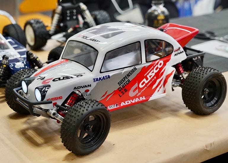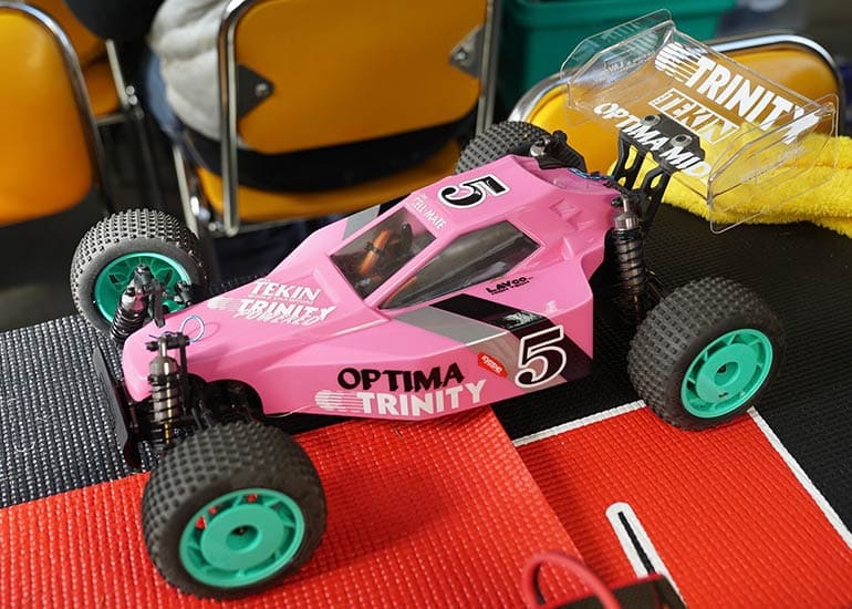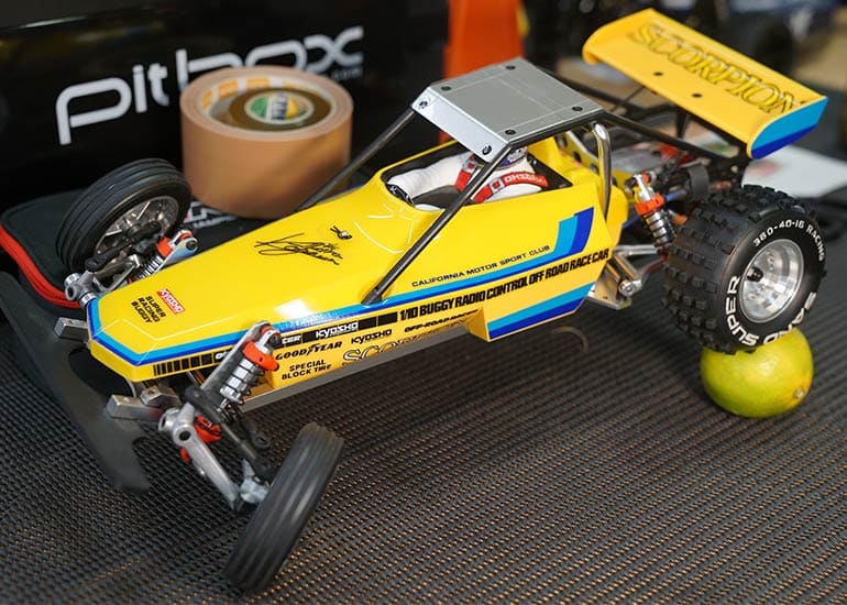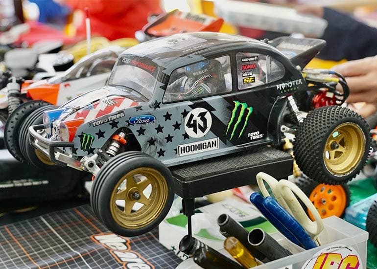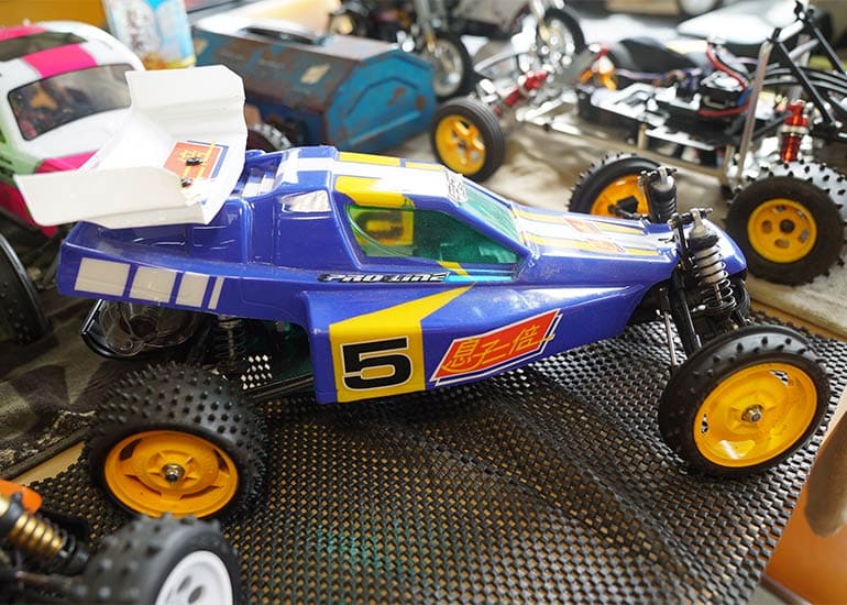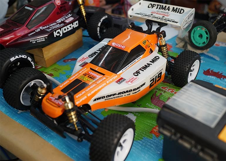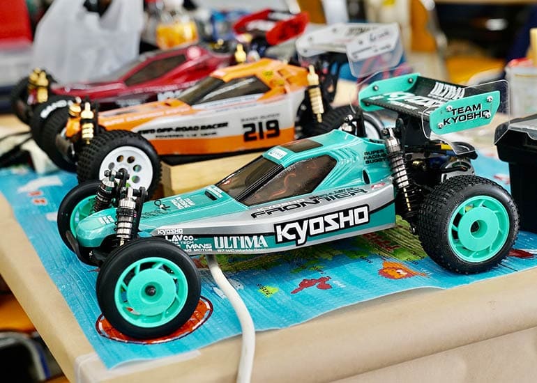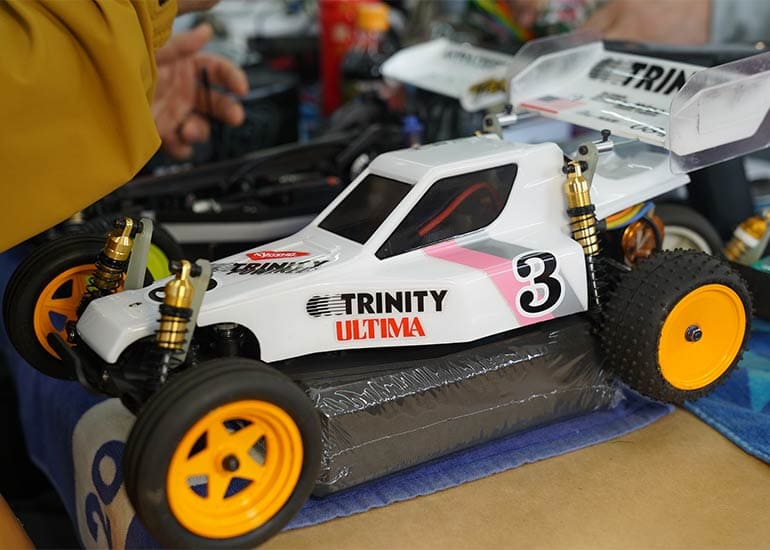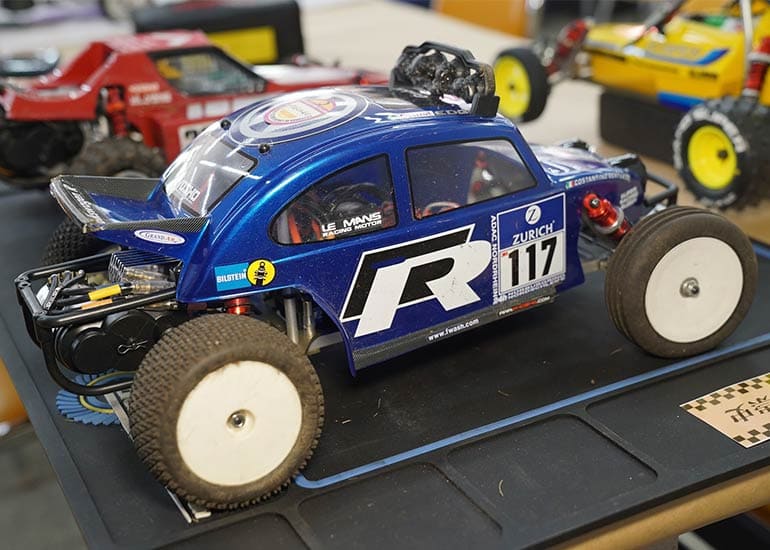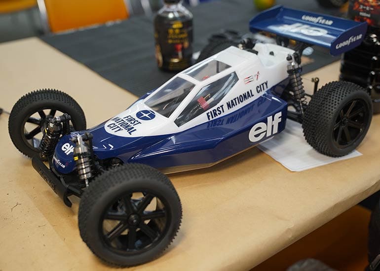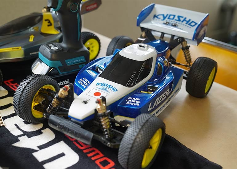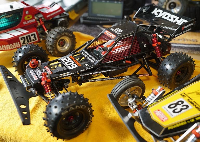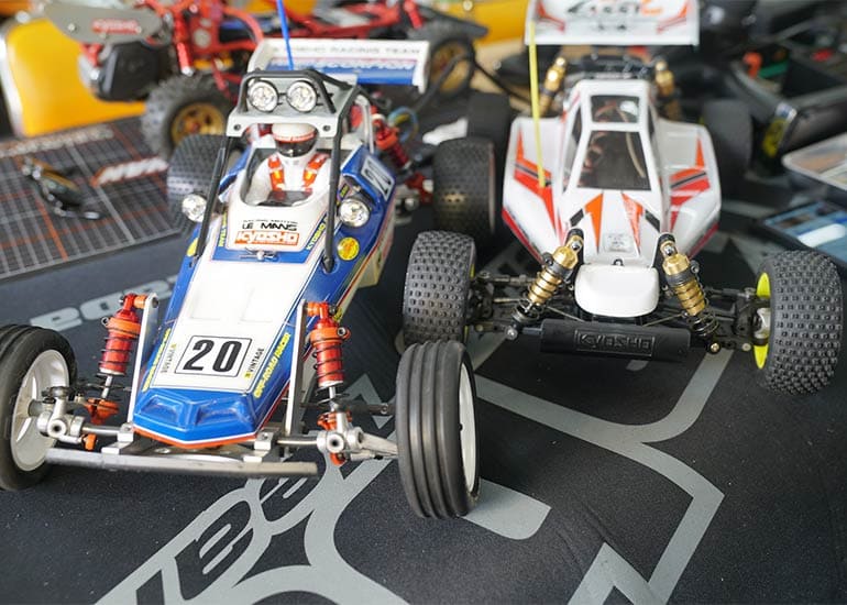 当時の熱気を伝えるトークショーには豪華ゲストが集結し、ビンテージシリーズ生みの親である粉川 章氏が今年も参加。そして、伝説の京商ワークスドライバー高麗 淳一氏と、現役の京商社員ドライバーの松本 裕之氏も会場を盛り上げます。さらに今回は特別ゲストとして、京商開発チームでEPレース部門を担当し、高麗さんの発掘にも大きな貢献をした、現在はサガミマイクロ代表取締役社長の中西 和弘(通称:ドクター中西)氏にもご参加いただきました。今回メインイベントの一つである熱気溢れるトークセッションでは、大型スクリーンに当時の貴重な記事や広告、そして秘蔵写真の数々を投影。豪華ゲスト4名が語る思い出話は、参加者にとっても何者にも代えがたいノスタルジーを感じさせてくれました。ただ単なる回顧録に留まらず、今まで表に出ることがなかった裏話も飛び出し、会場からは驚きの声も上がっていました。