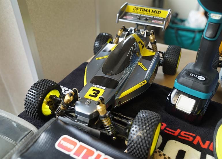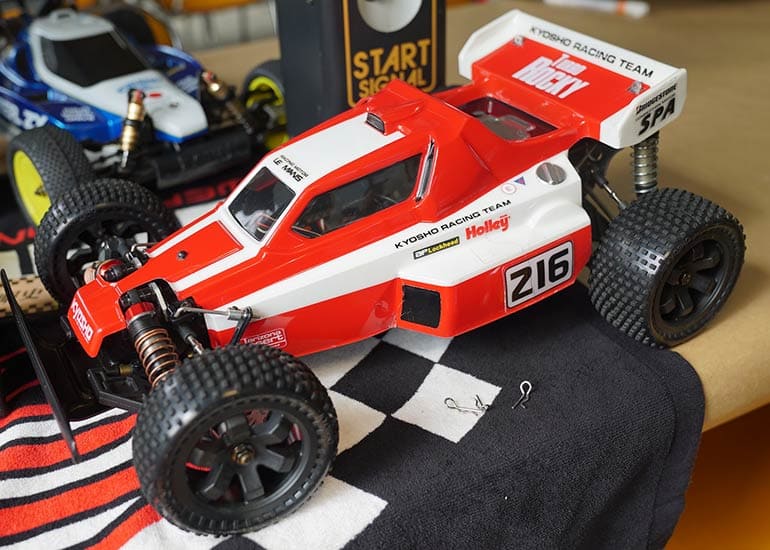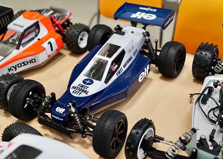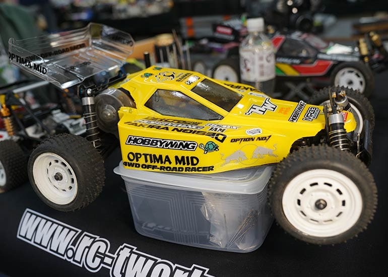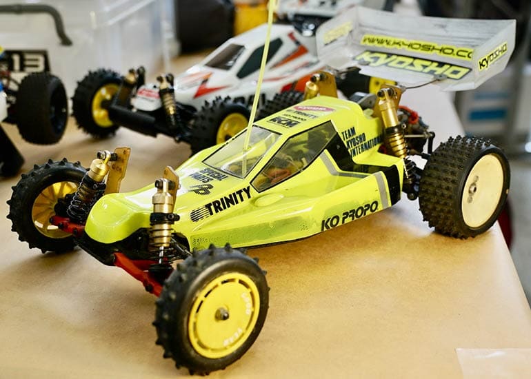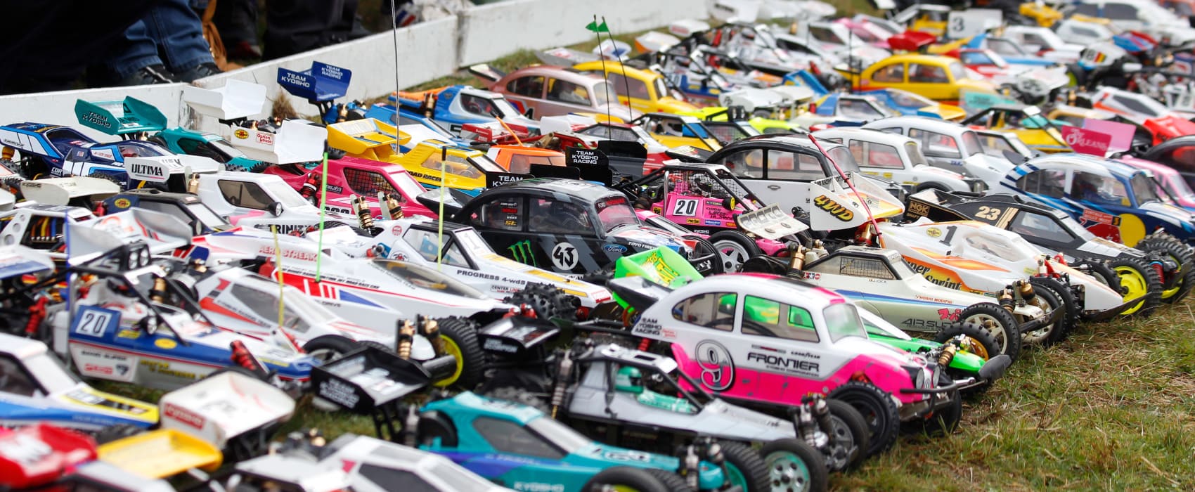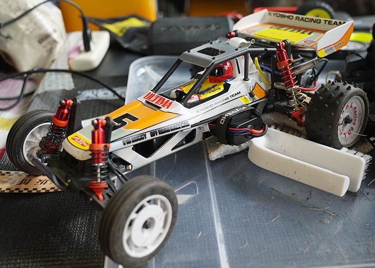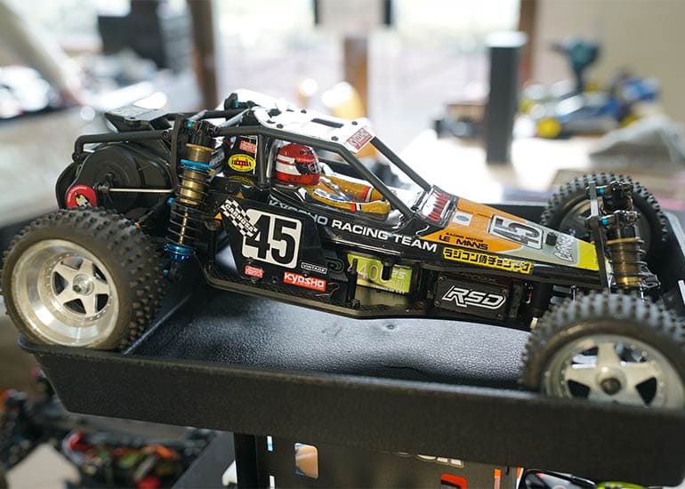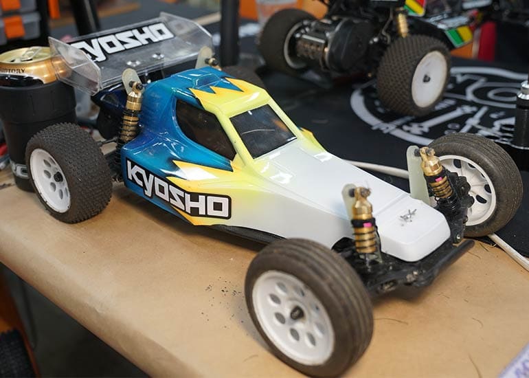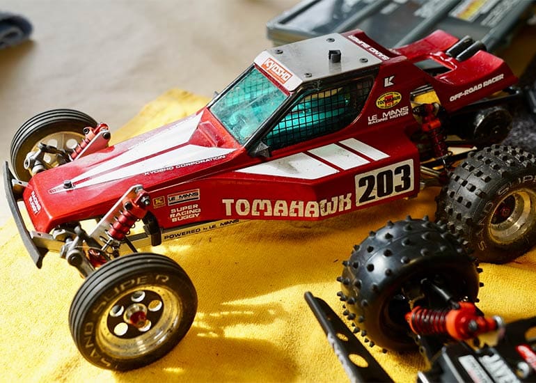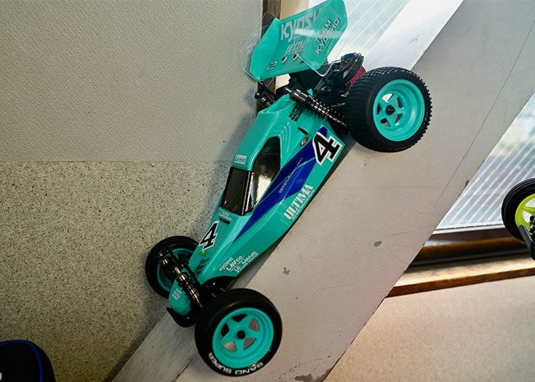 当時の熱気を伝えるトークショーには豪華ゲストが集結し、ビンテージシリーズ生みの親である粉川 章氏が今年も参加。そして、伝説の京商ワークスドライバー高麗 淳一氏と、現役の京商社員ドライバーの松本 裕之氏も会場を盛り上げます。さらに今回は特別ゲストとして、京商開発チームでEPレース部門を担当し、高麗さんの発掘にも大きな貢献をした、現在はサガミマイクロ代表取締役社長の中西 和弘(通称:ドクター中西)氏にもご参加いただきました。今回メインイベントの一つである熱気溢れるトークセッションでは、大型スクリーンに当時の貴重な記事や広告、そして秘蔵写真の数々を投影。豪華ゲスト4名が語る思い出話は、参加者にとっても何者にも代えがたいノスタルジーを感じさせてくれました。ただ単なる回顧録に留まらず、今まで表に出ることがなかった裏話も飛び出し、会場からは驚きの声も上がっていました。